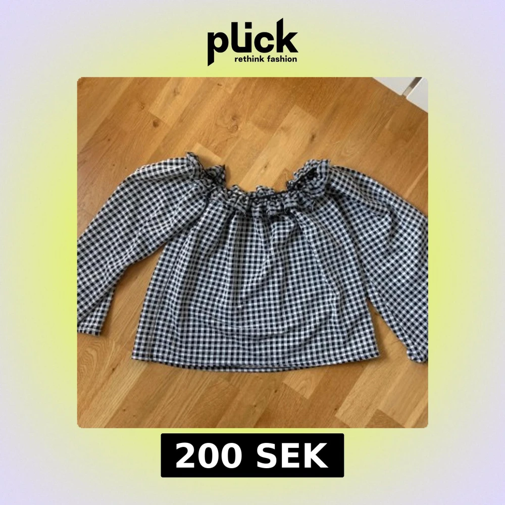 Säljer en svartvit rutig blus från NLY Trend med offshoulder-modell och långa ärmar. Blusen har volangdetalj upptill och är perfekt för dig som gillar en trendig och avslappnad stil. Ganska stor i storleken så sitter som en M