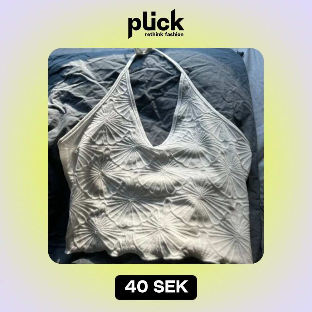 Säljer en vit halterneck topp med blommönster. Toppen är i ett mjukt och stretchigt material av polyester och elastan. Den har en knytning i nacken och en v-ringad design. Helt ny aldrig använd.