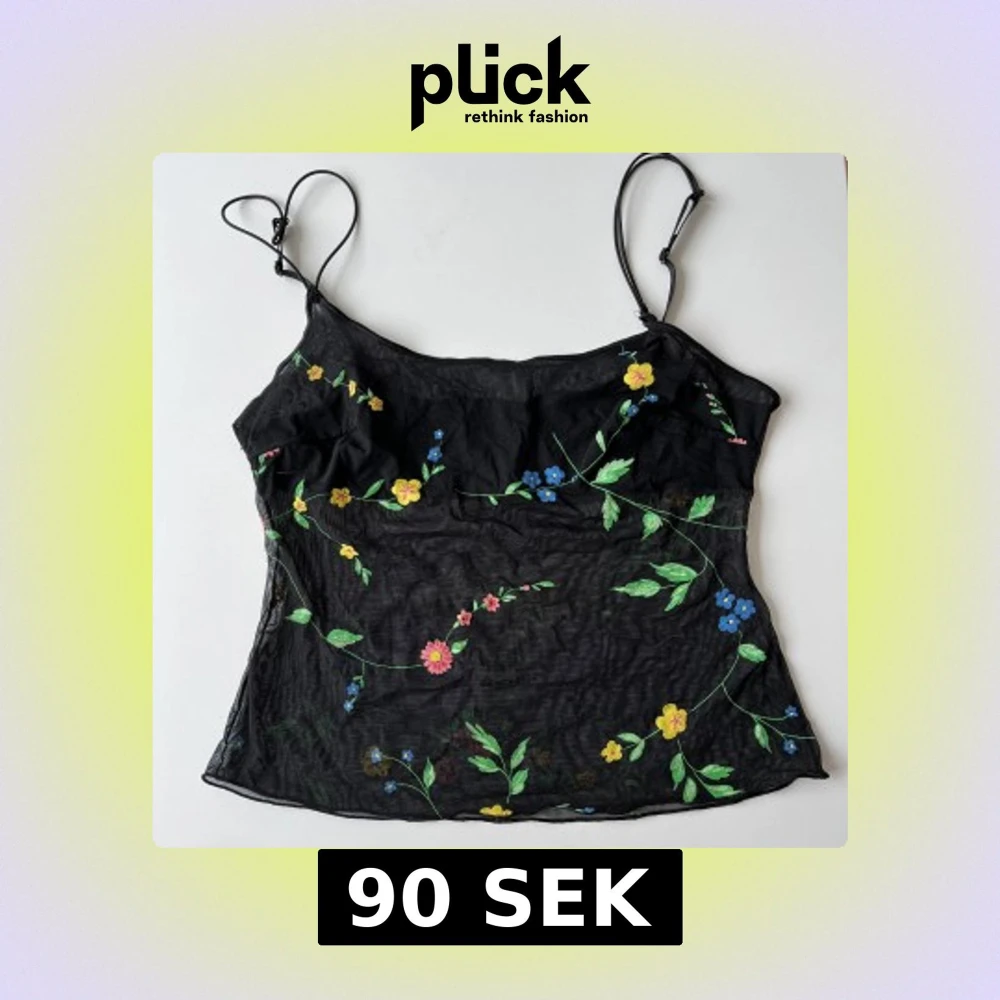 Säljer en svart linnetopp med färgglada blommor i gult, blått och rosa. Toppen har tunna axelband och ett lätt transparent material som ger en luftig känsla. Perfekt för varma dagar!