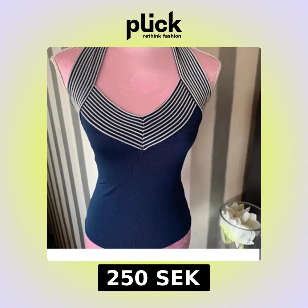 Snygg mörkblå halterneck topp med vita ränder. Toppen har en åtsittande passform och är perfekt för en stilren look. Den ärmlösa designen ger en modern touch.