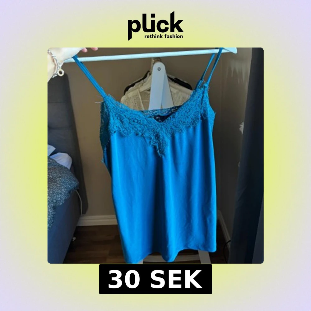 Snygg blå linnetopp spetsdetalj längs halsringningen.