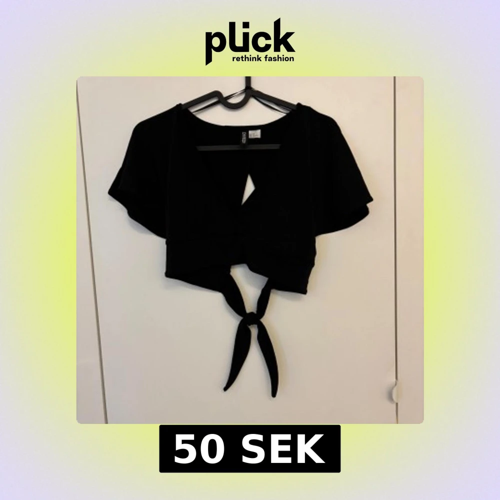 Säljer en svart croppad blus från H&M Divided med korta ärmar och knytning baktill.