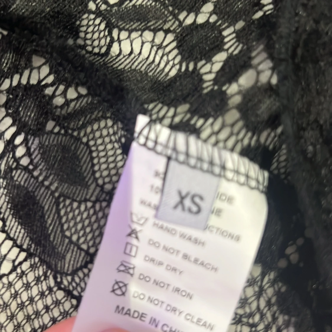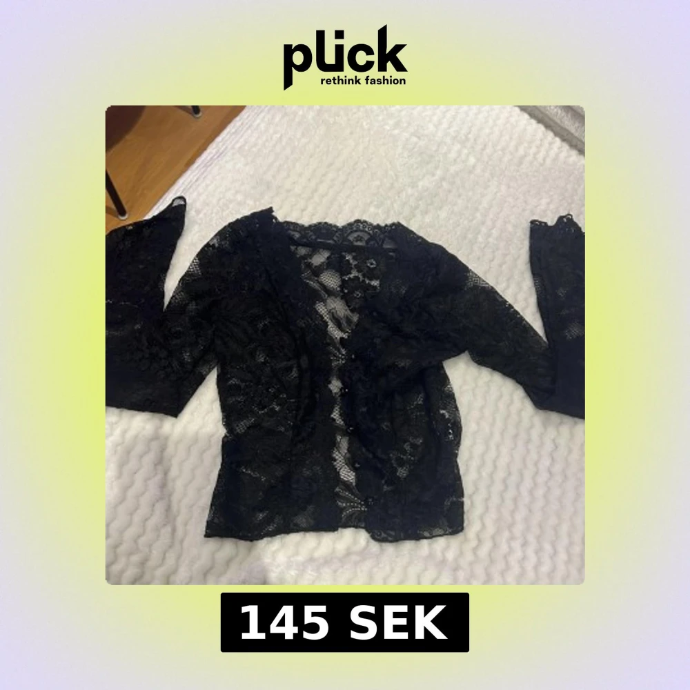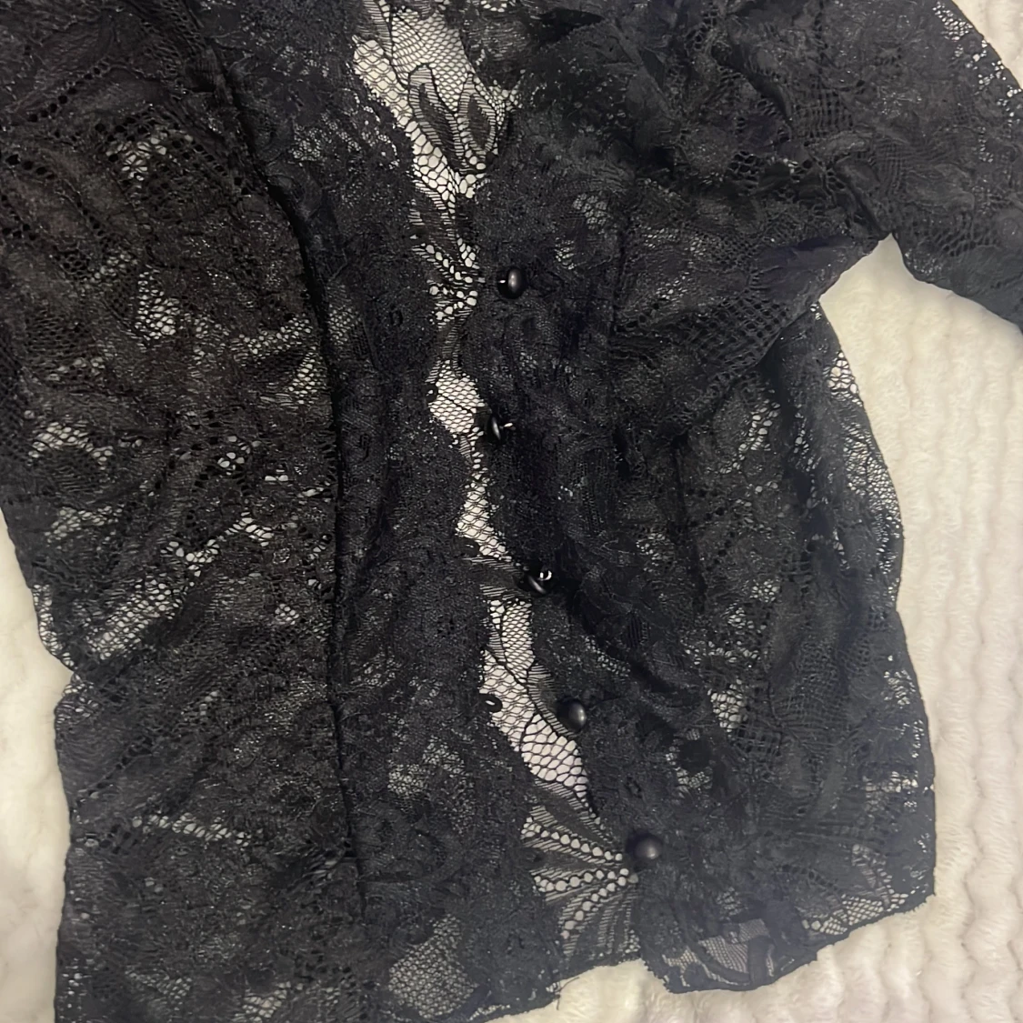 Säljer en svart blus i genombruten spets med långa ärmar och knappar framtill. Blusen har en spetsdetalj och skit fin fest tröja!🤩