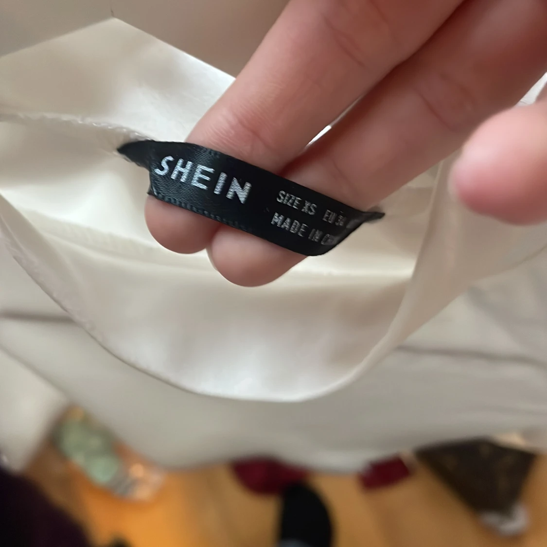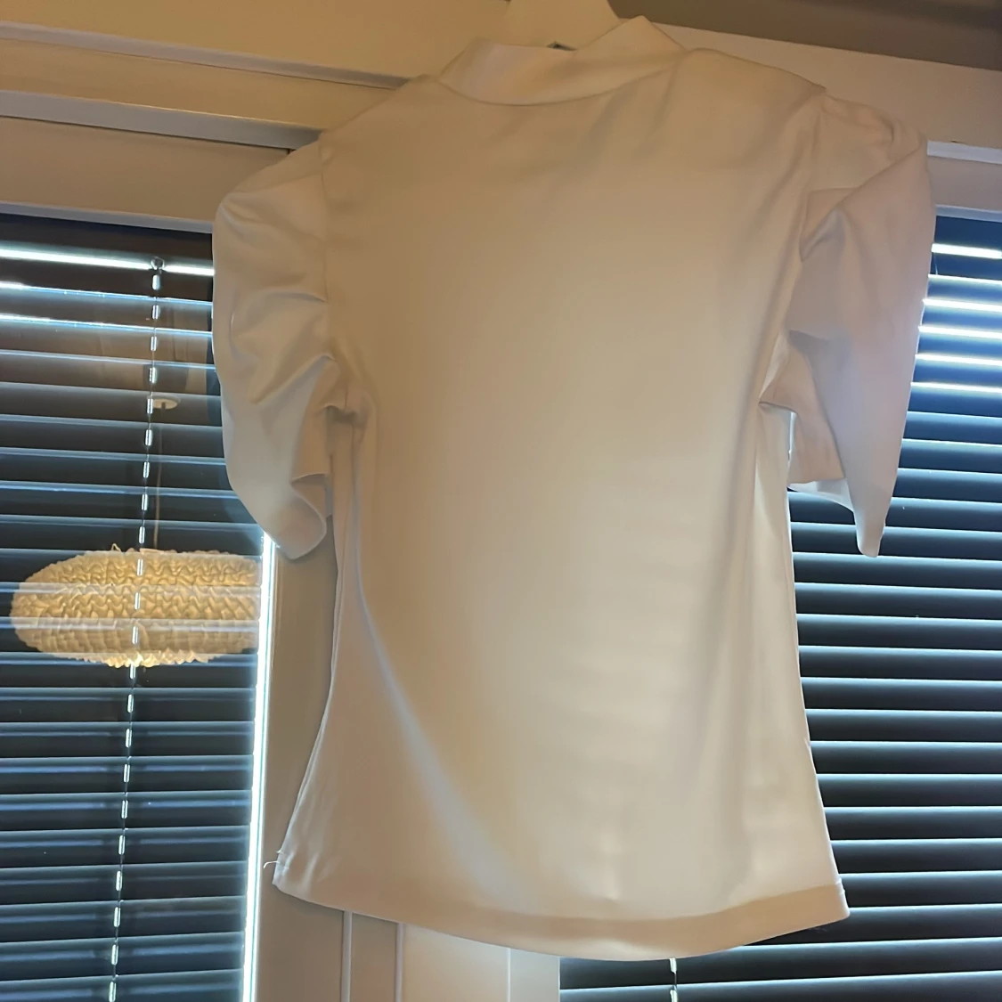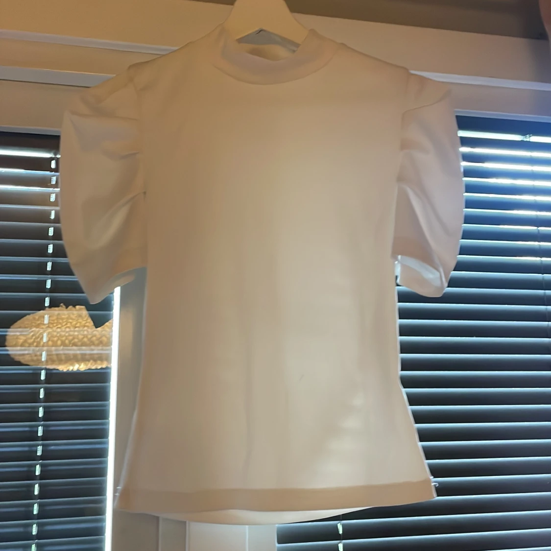 Säljer en vit topp från SHEIN med korta puffärmar och rund halsringning. Toppens material är slätt och har en stilren design som passar perfekt till olika outfits. Enkel men ändå trendig med fokus på ärmarnas volym.