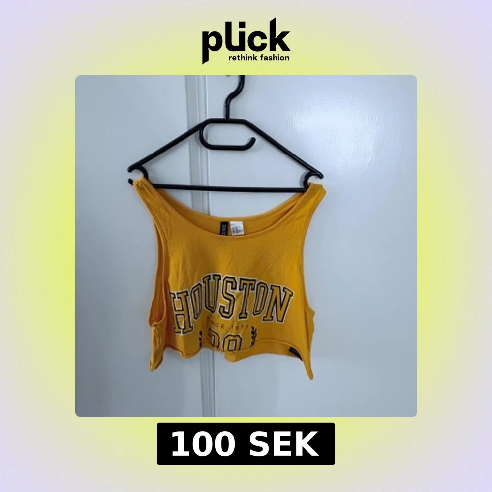 Säljer en gul croppad linnetopp från Divided med stort Houston-tryck framtill. Toppen har breda axelband och är ärmlös, perfekt för varma dagar eller som ett statement-plagg.