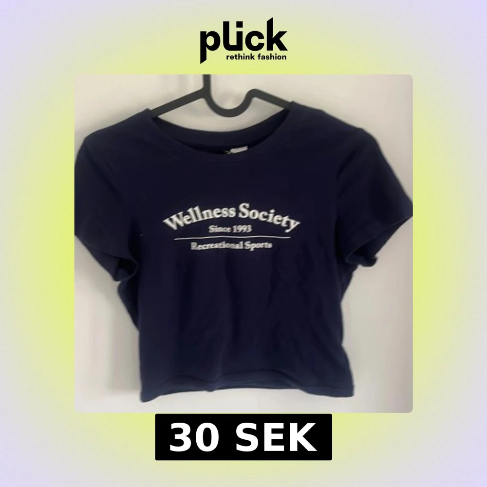 Säljer en mörkblå croppad t-shirt från Divided med vit text 'Wellness Society' framtill. T-shirten har rund halsringning och korta ärmar. Perfekt för en avslappnad stil.
