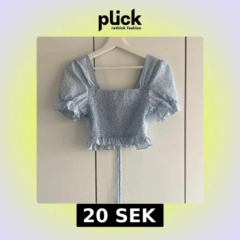 Supersöt ljusblå croppad blus från SHEIN med små vita blommor, puffärmar och volangdetalj nertill. Smockad över bysten och knytband bak. Perfekt för vår och sommar! Inte använd.