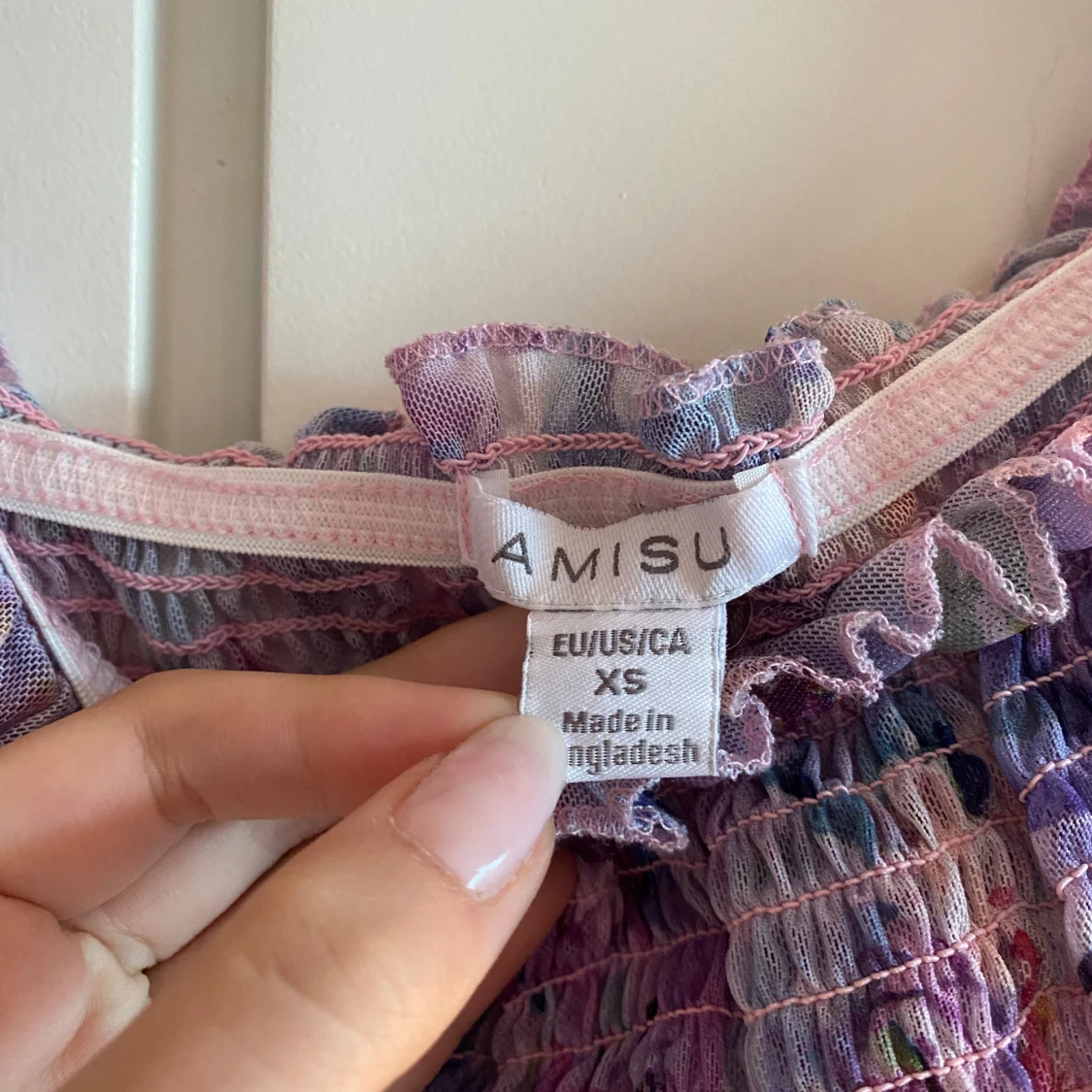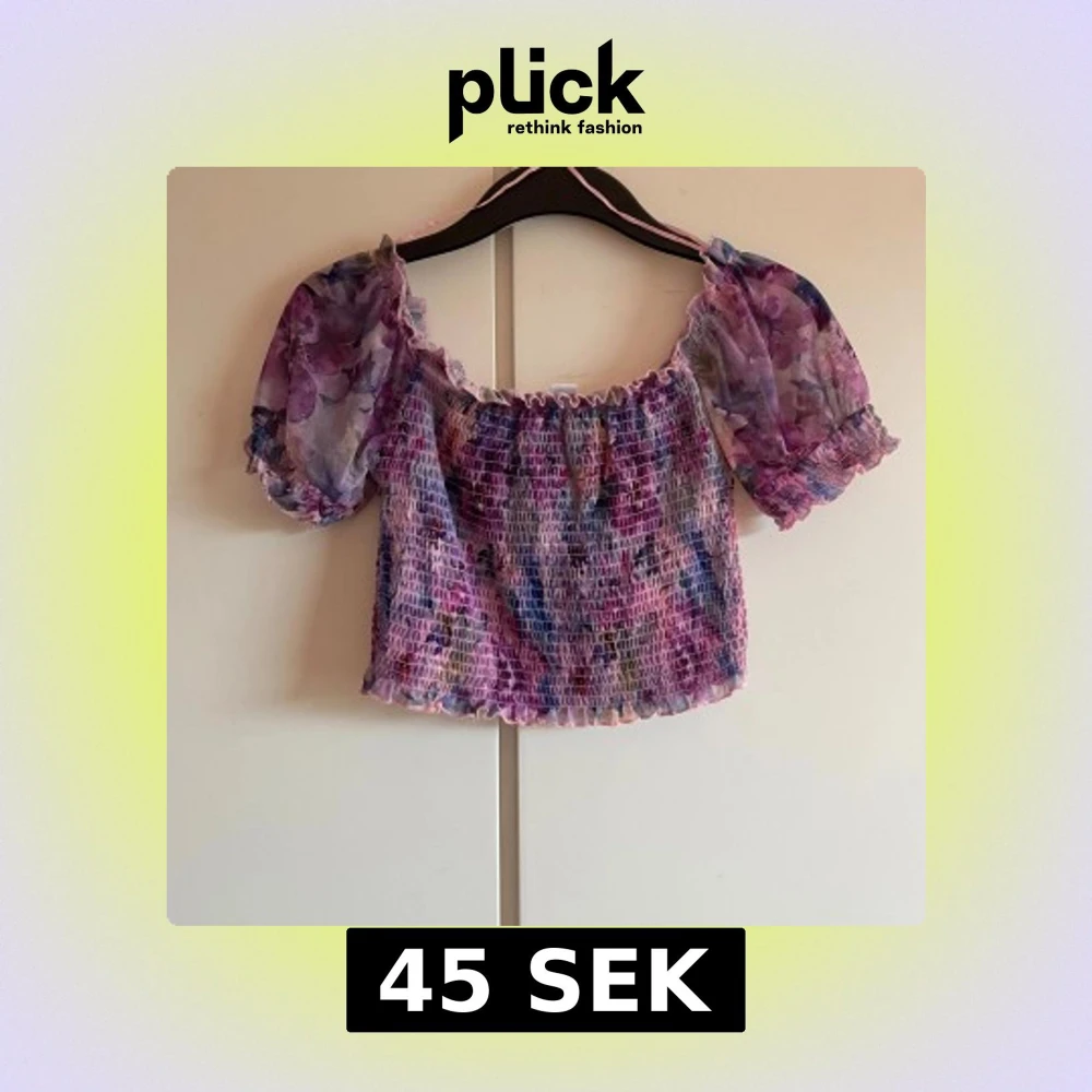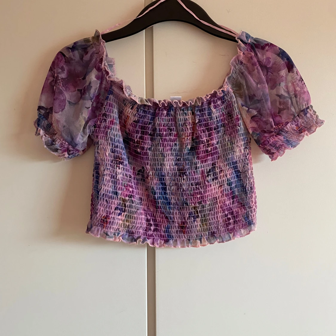 Superfin blommig croppad topp från Amisu i lila, rosa och blå toner. Toppen har puffiga korta ärmar och smockad resår över hela kroppen. Perfekt för varma dagar och ger en söt och trendig look.