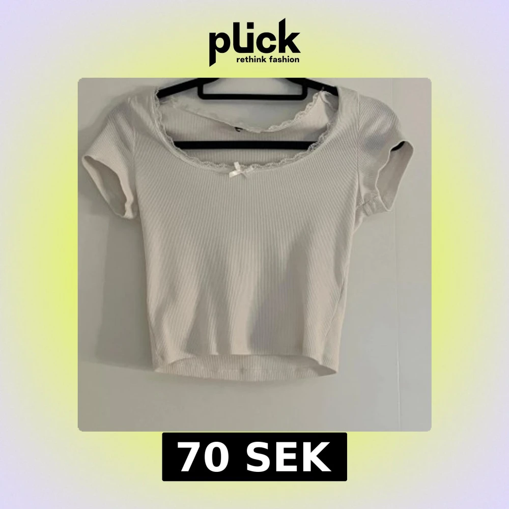 Söt vit ribbad topp med korta ärmar och spetskant vid halsringningen. Toppen har en liten rosett framtill.