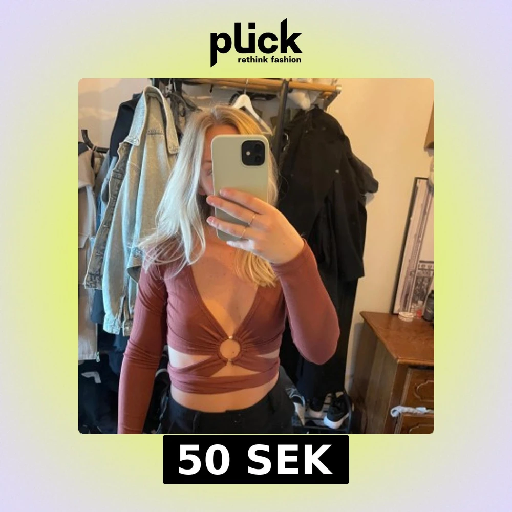 Trendig rostbrun croppad omlottopp med lång ärm och ribbad struktur. Toppen har djup v-ringning, knyt i ryggen och en dekorativ ring framtill. Perfekt för att skapa en snygg och modern look.