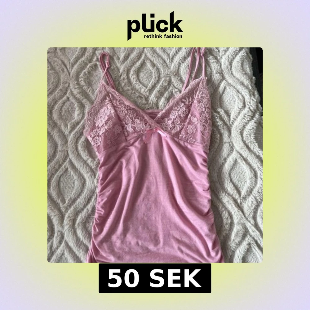 Säljer ett sött rosa linne med spetsdetaljer och smala axelband. Linnet har en liten rosett framtill och är perfekt för en varm dag.
