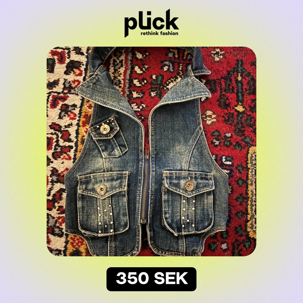 jeansväst med dragkedja och stenar på fickorna. Västen har en unik design med stora fickor och en bred krage. Och sitter jättefint
