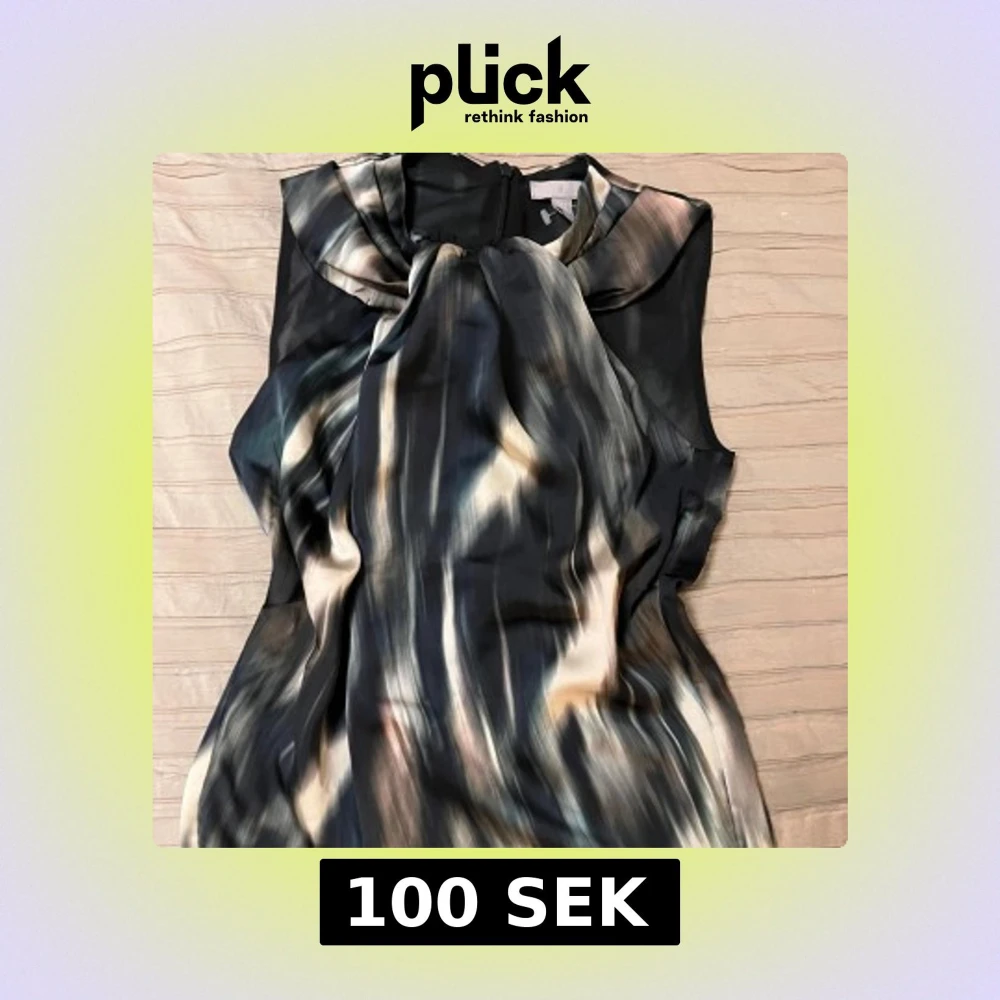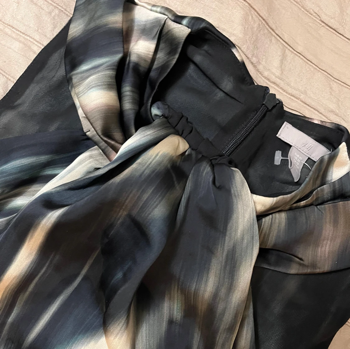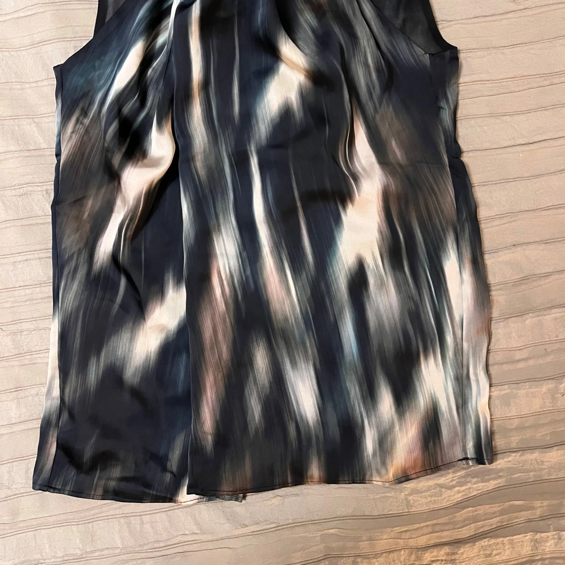 Snygg ärmlös topp med abstrakt mönster i mörka och ljusa toner. Klänningen har en elegant drapering framtill och en diskret dragkedja i ryggen. Perfekt för en stilfull look. Strl Cs men passar mig som har S