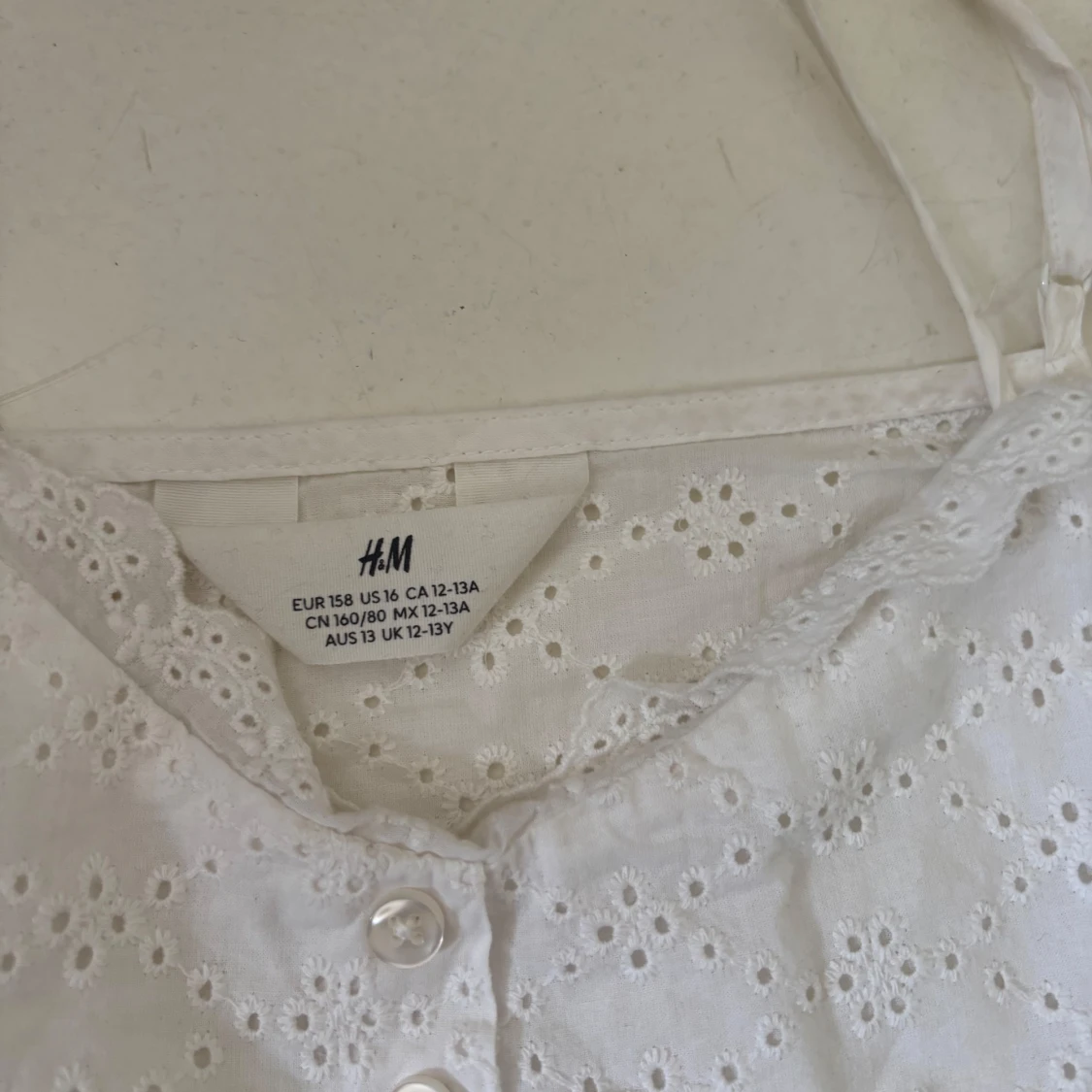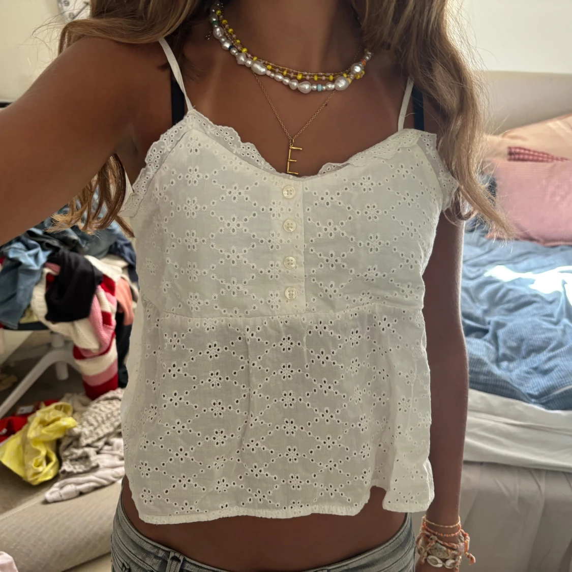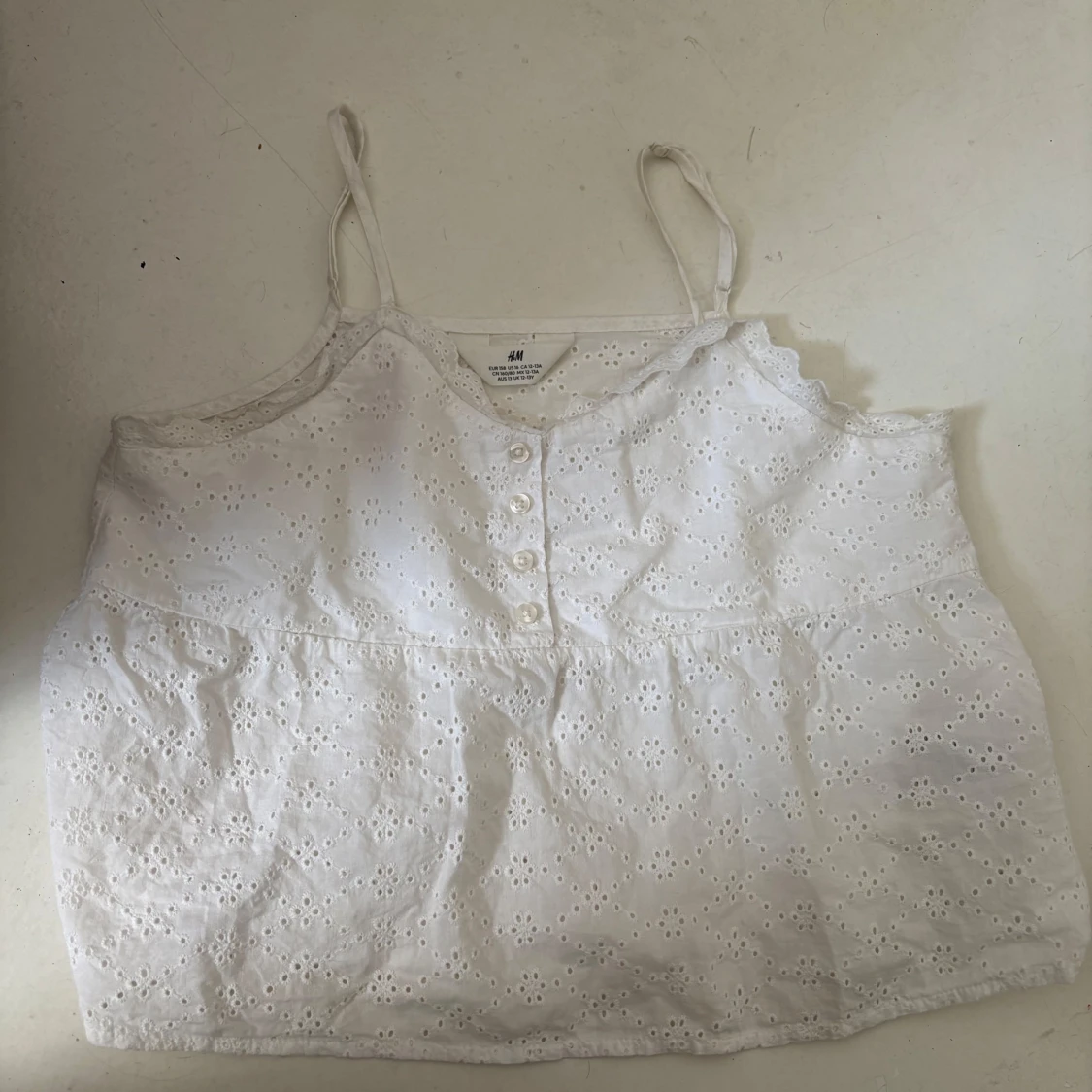 Superfin vit linnetopp från H&M med broderade blommor och små hål, knappar framtill och tunna axelband. Toppen har en söt volangkant upptill och är perfekt för varma dagar. Lätt och luftig i bomull, passar till jeans eller kjol. Jättefint att ha som festtopp eller under en kofta. Så coolt linne som inte är basic och liknar Brandy Melville. Storlek 158 men sitter som xs