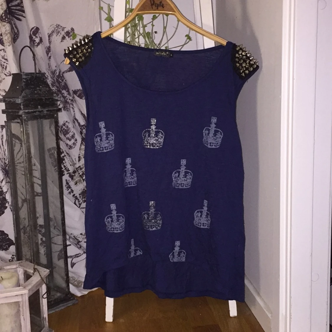 Marin blå tröja från diables med guldiga nitar på axlarna och kronor på framsidan Något nopprig, inte något som stör Ny pris 200kr