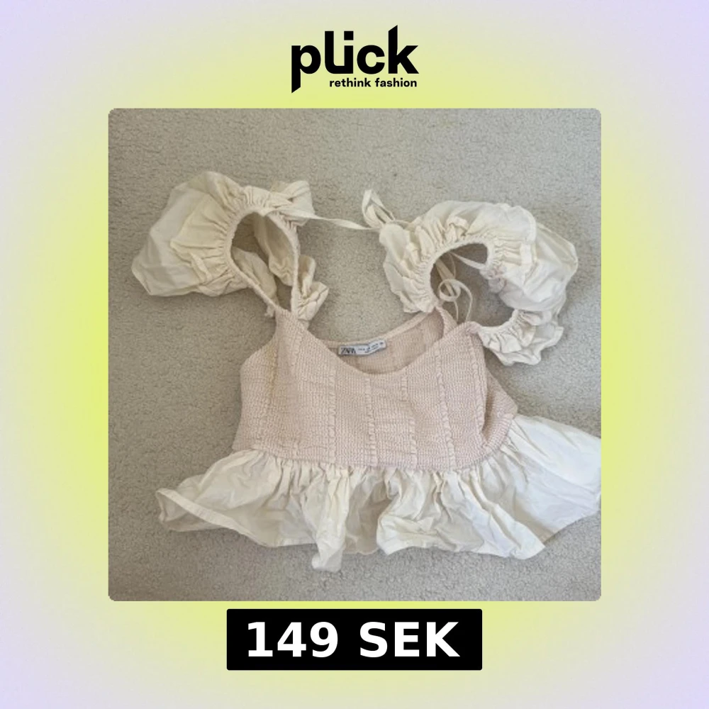 Supersöt beige topp från Zara med smockad överdel och volang nertill. Axelbanden är breda och har volanger samt knyt, vilket ger en romantisk vibe. Perfekt för varma dagar och riktigt snygg till jeans eller kjol.