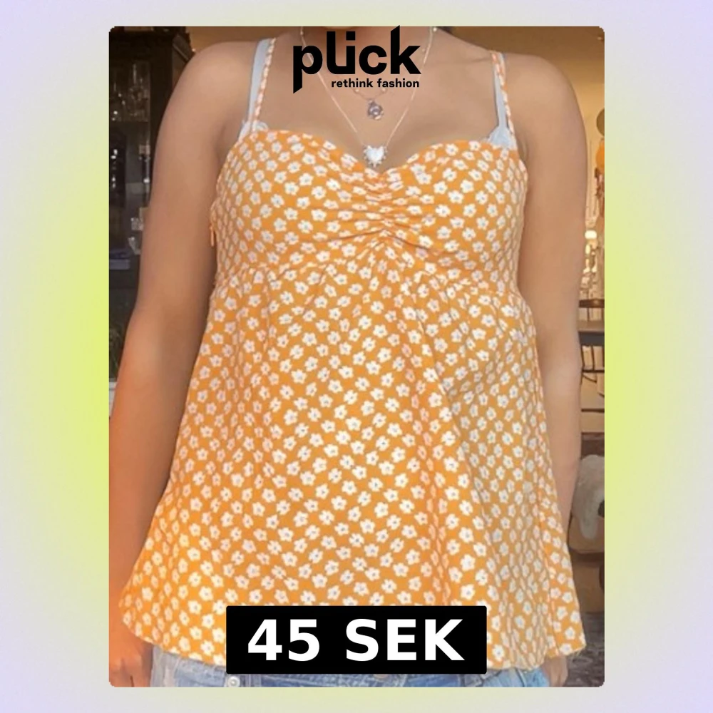 Supersöt gul linnetopp med vita små blommor och rynkdetalj vid bysten. Toppen har smala axelband och en luftig, lätt utsvängd passform som är perfekt för varma dagar. Perfekt att styla med jeans eller kjol för en fräsch sommarlook.