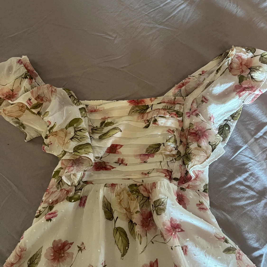 Säljer en romantisk blommig blus i vit ton med rosa och gröna blommor. Toppen har volang och en smockad rygg för extra komfort. Materialet är lätt och luftigt, perfekt för varma dagar. Passar dig som gillar en feminin och trendig stil.