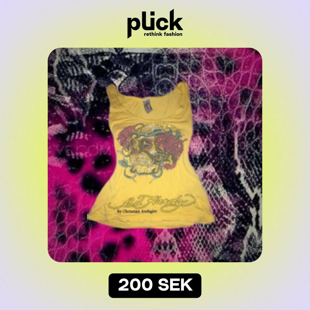 Ed Hardy linne i en gul färg med rhinestones. Linnet är i storlek 38 (M) och har knappt används. Några få stenar har ramlat av men inget man märker, klicka på köp nu om intresserade !!💗💗