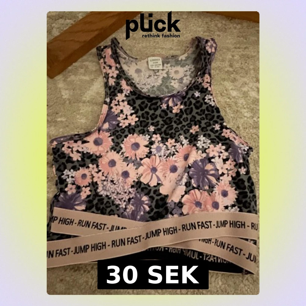Cool linnetopp från Lindex med svart leopardmönster och blommor i rosa och lila. Elastiskt band nedtill med texten 'RUN FAST - JUMP HIGH' i svart. Perfekt för träning eller sportiga dagar. Materialet är mjukt och stretchigt polyester.