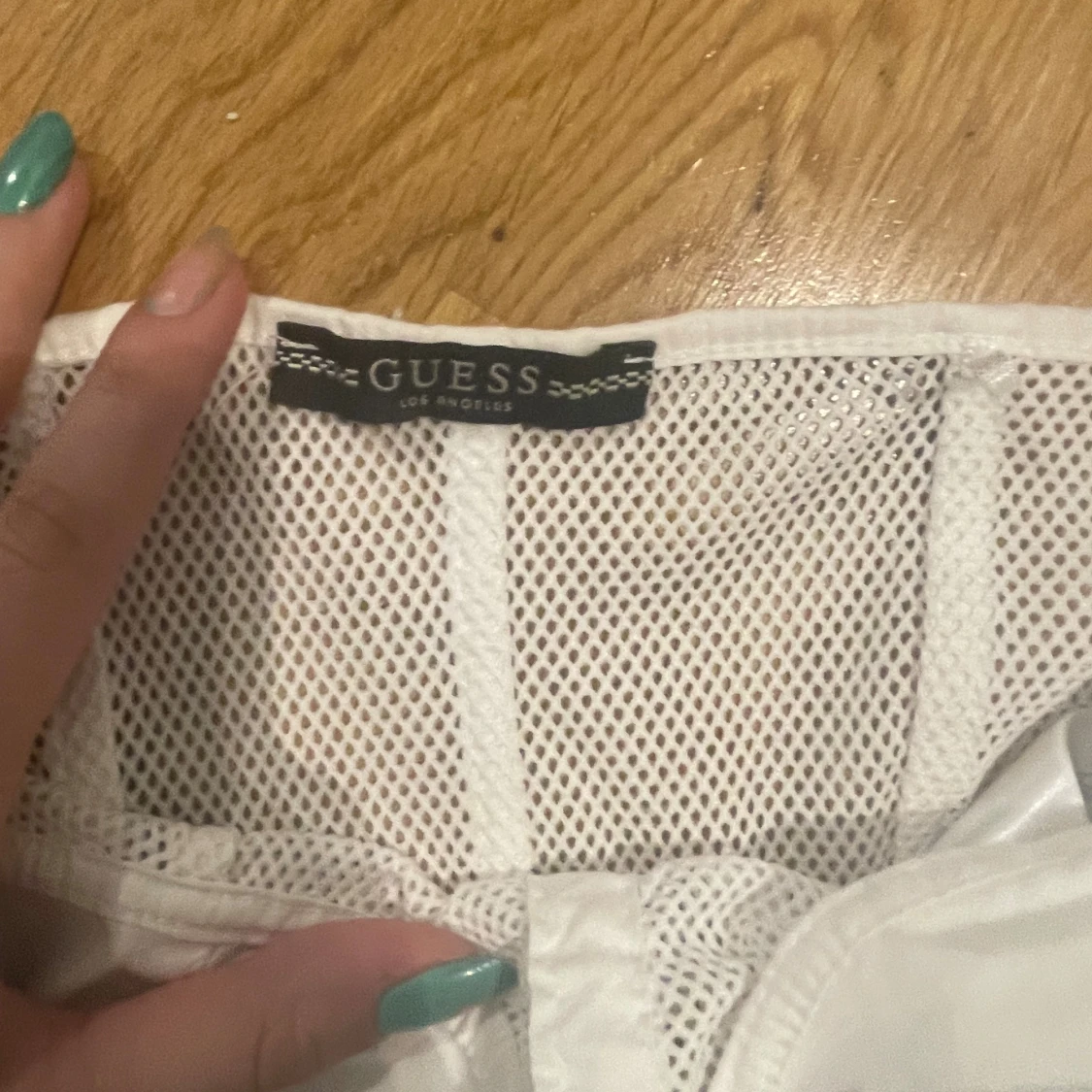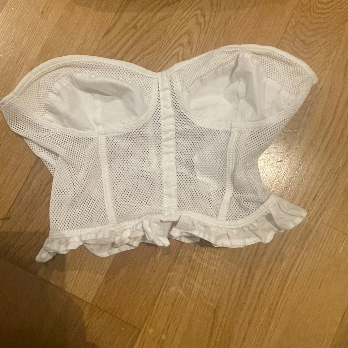 Säljer en vit korsett från Guess med meshdetaljer och snygg volangkant nedtill. Toppen är axelbandslös och har en strukturerad form med markerade kupor. Perfekt för dig som vill ha en trendig och feminin look.