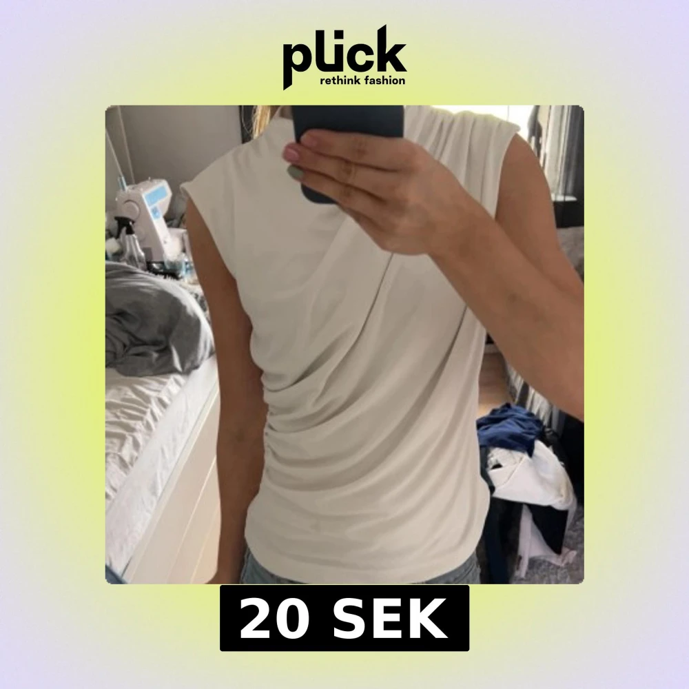Säljer en vit ärmlös topp med omlott-drapering framtill. Toppen har en figurnära passform. Lappen är bortklippt så vet inte märket. Den har även en lite fläck som jag är osäker på om den går att få bort, därav priset🤗