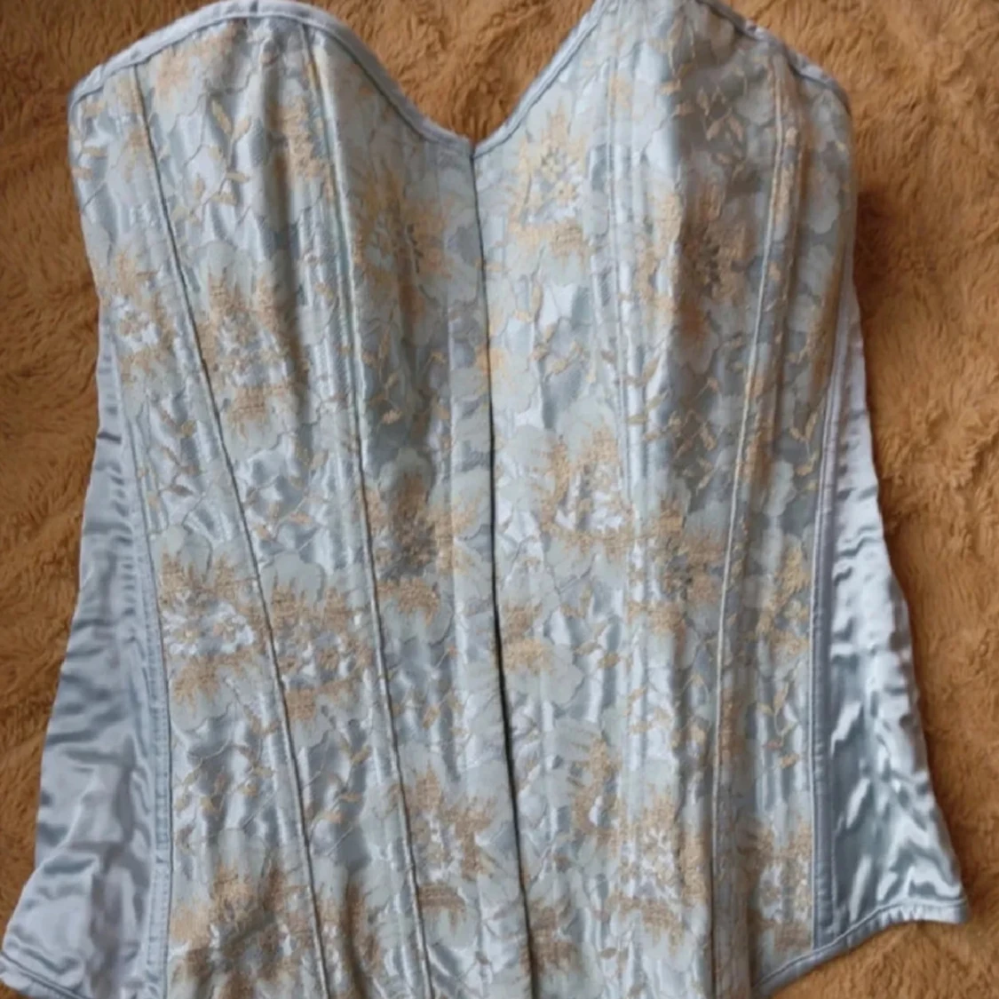 Säljer en superfin ljusblå korsett med vackra broderade blommor i guld. Den har en klassisk passform och är perfekt för festliga tillfällen. Materialet känns lyxigt och ger en elegant look. Passar perfekt till både kjol och byxor!