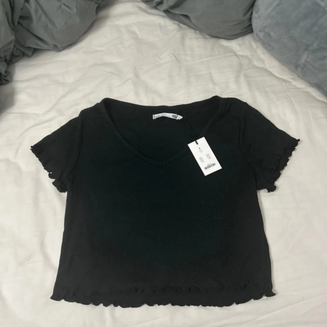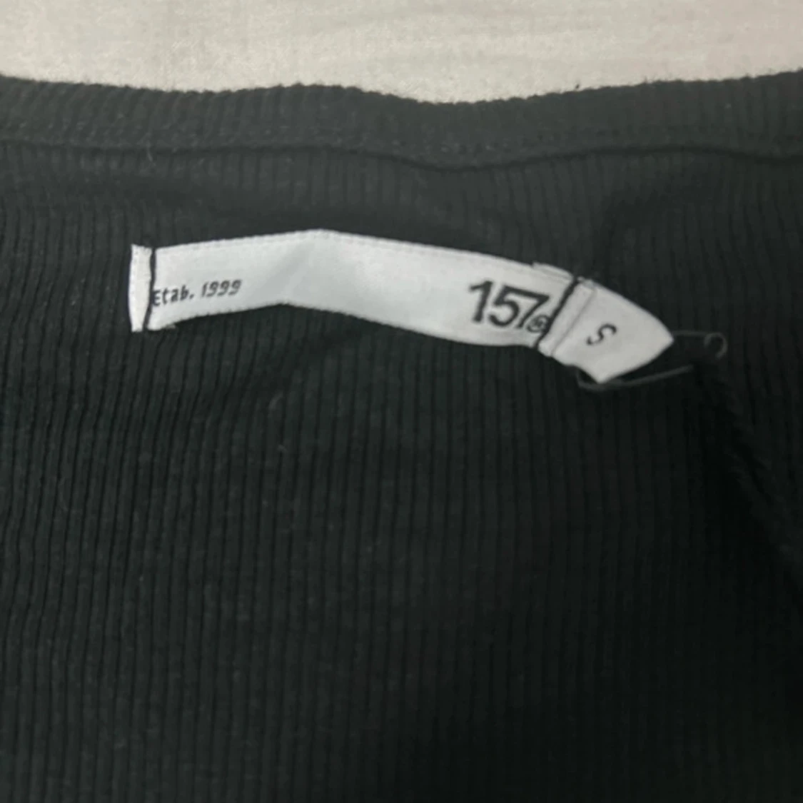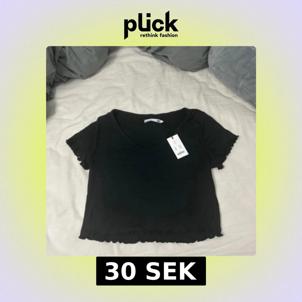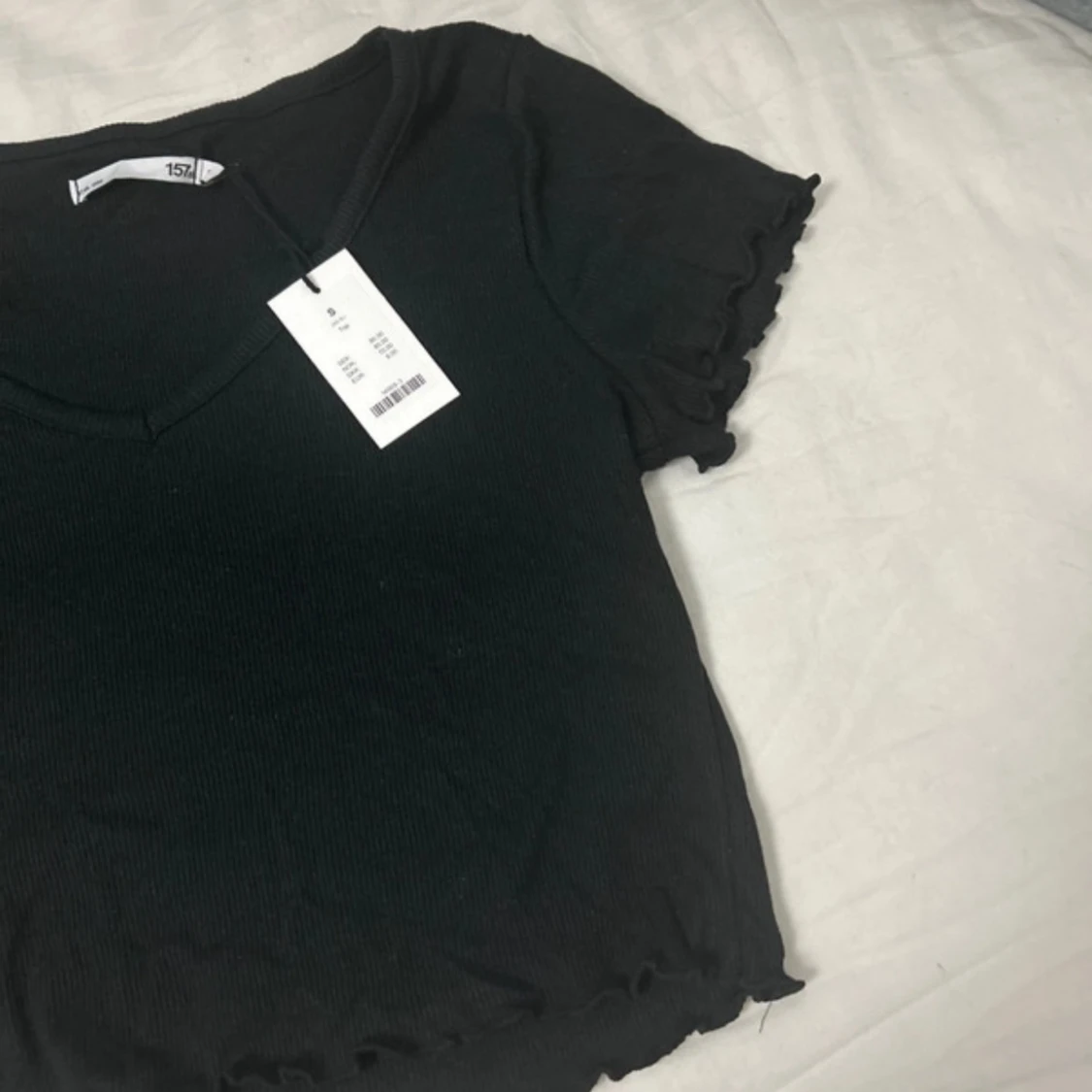 Säljer en svart ribbad topp från 157 i storlek S. Toppen har en v-ringad hals och korta ärmar med volangdetaljer. Perfekt för en stilren look.