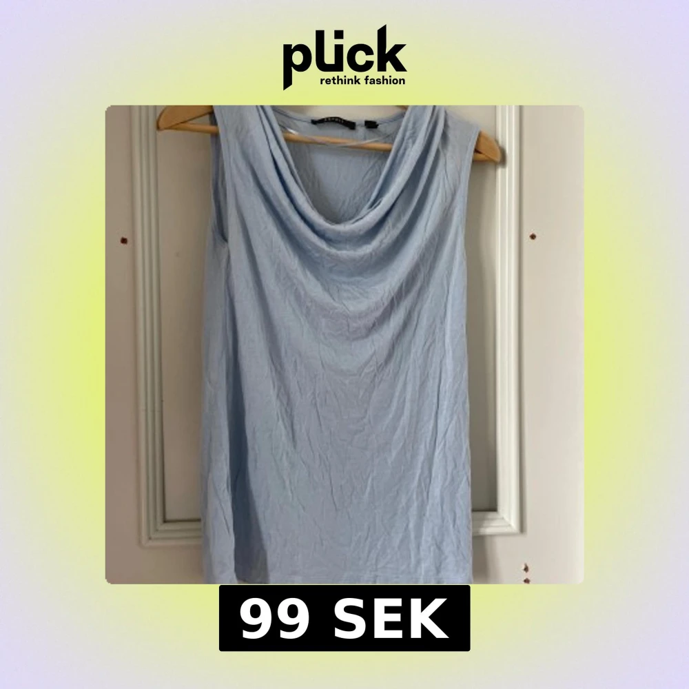 Säljer en ljusblå ärmlös topp från Esprit med snygg draperad halsringning. Perfekt för varma dagar och enkel att matcha med både jeans och kjol. Mjuk och skön bomullskänsla.
