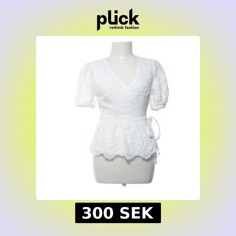 Superfin vit blus från Lipsy med v-ringning, kort puffärm och omlottknytning i midjan. Blusen är täckt av blommig spets och har en lätt volangkant nedtill. Perfekt för dig som gillar romantiska detaljer och vill ha en feminin look.