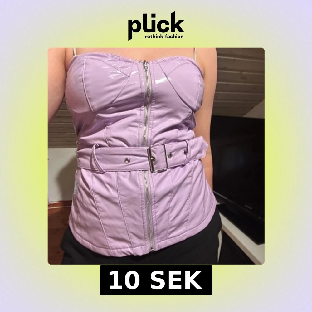 Säljer en lila korsett från PrettyLittleThing med glansig finish och markerade sömmar. Toppen har dragkedja framtill och ett brett bälte i midjan med silverspänne. Perfekt för dig som vill sticka ut med en edgy look. Köpt på Sellpy men jag har aldrig använt den💜