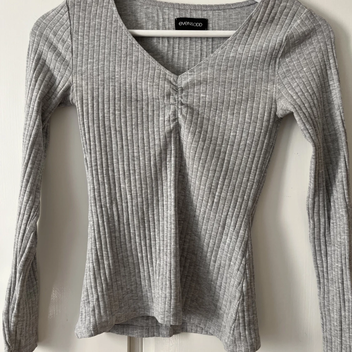 En ribbad grå topp. Den är v ringad.