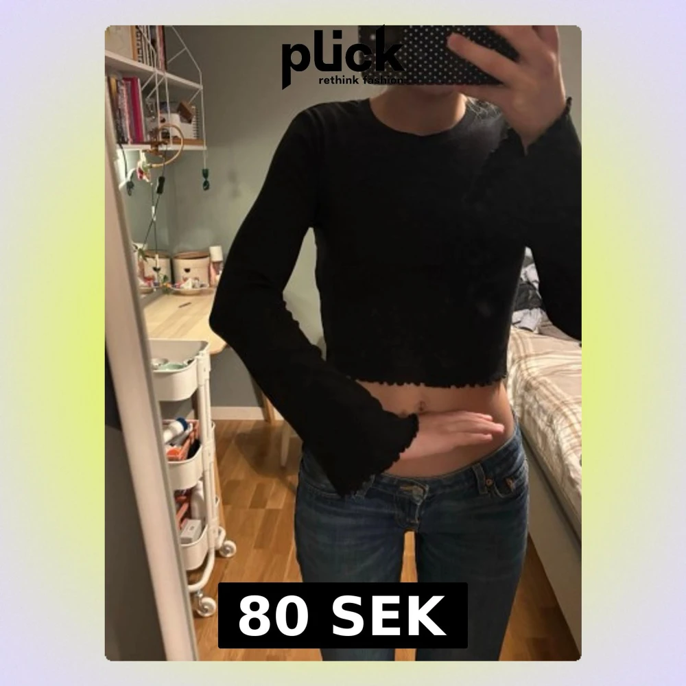 Säljer en svart croppad topp med långa ärmar och vågiga kanter vid ärmslut och nederkant. Toppen har en enkel, stilren design och är perfekt att matcha med jeans eller kjol. Materialet känns mjukt och stretchigt för en bekväm passform.