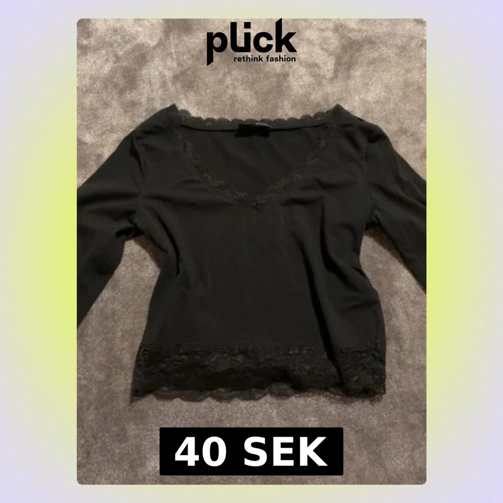 Svart långärmad topp med v-ringning och spetsdetaljer längs halsringningen och nederkanten. Tunn och mjuk, perfekt att styla med jeans eller kjol. Enkel men ändå elegant design som ger en snygg touch till din outfit.