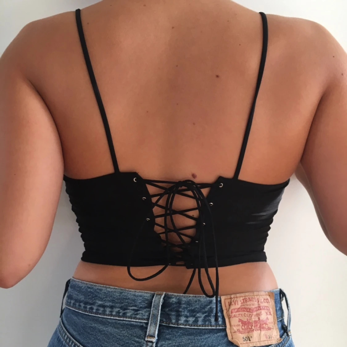 Fin svart vintage croptop med snörning i ryggen. Elastiskt och tunt material. Frakt på 10kr tillkommer🔥