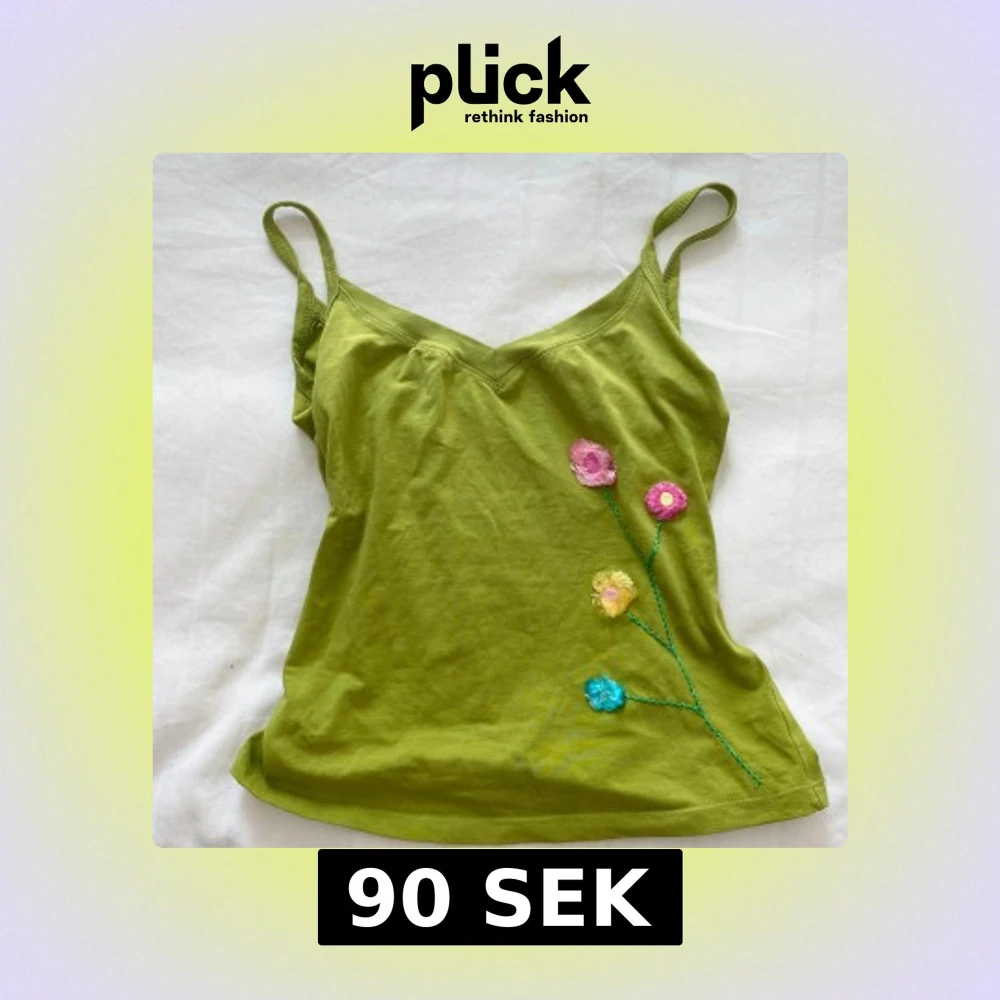 Säljer en grön linnetopp med smala axelband och v-ringning. Toppen har broderade blommor i rosa, gul och blå längs ena sidan.