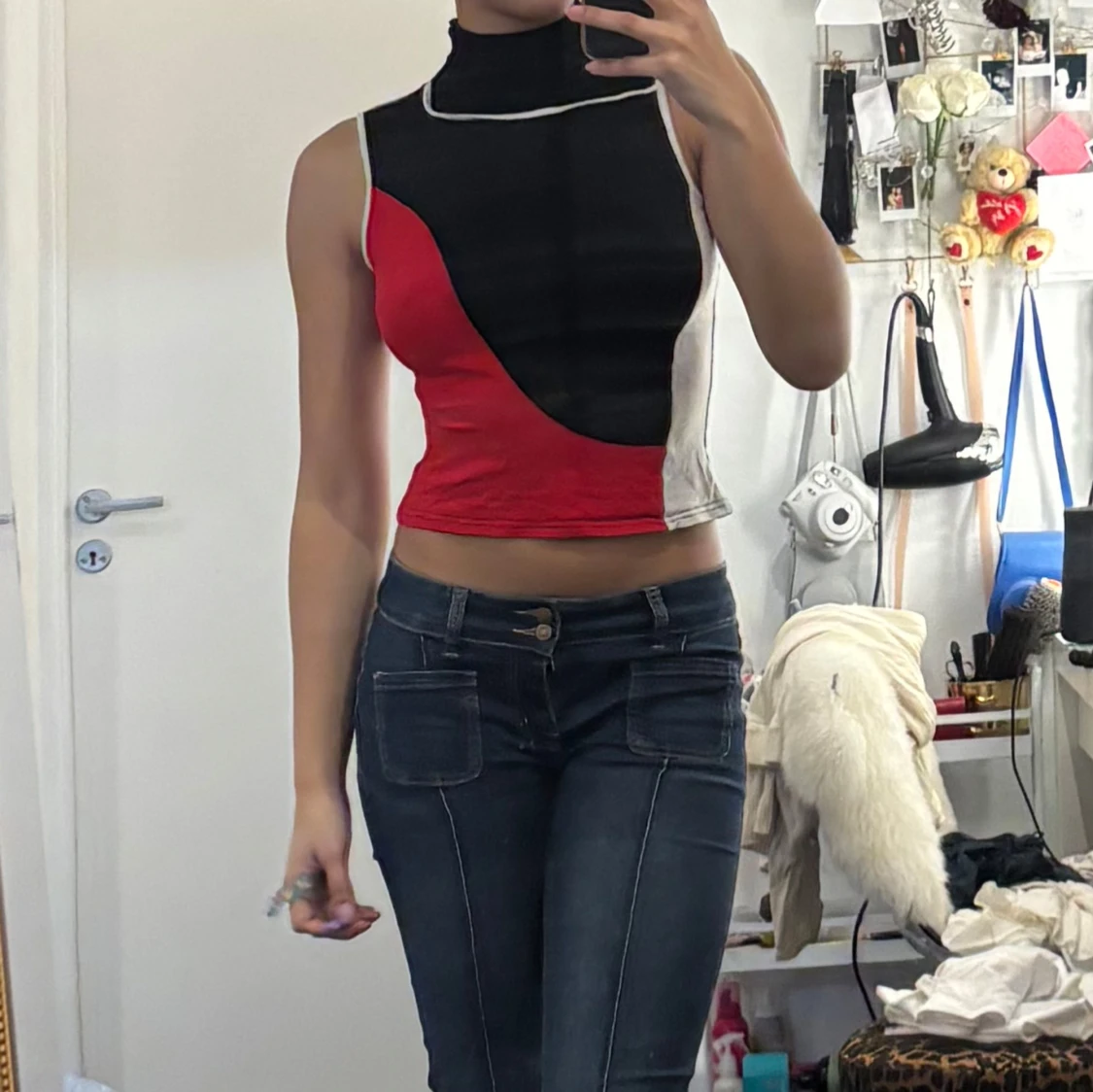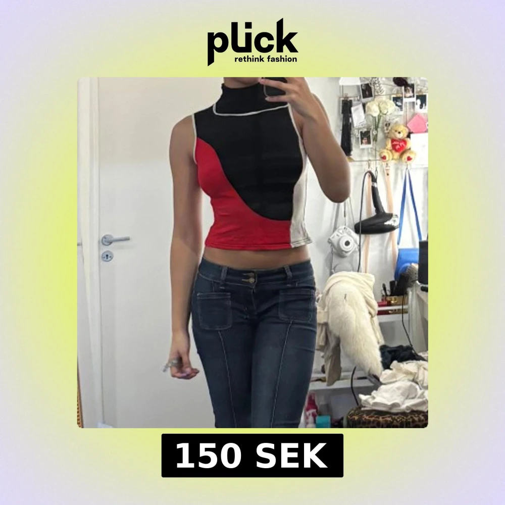 Säljer en unik croppad polotopp med höghalsad krage. Toppen har blockmönster i svart, rött, vitt och beige med kontrastsömmar. Ärmlös och figurnära passform, perfekt för att sticka ut. Står M/L på lappen men passar som XS/S