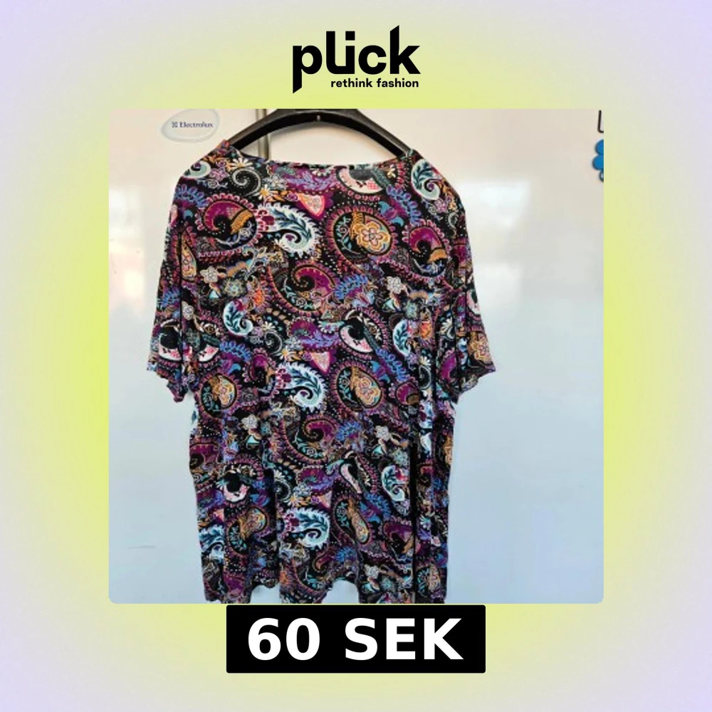 Säljer en färgglad topp med ett livligt paisleymönster i lila, rosa, blå och orange nyanser. Toppen har korta ärmar och en lös passform, perfekt för en avslappnad stil. Storlekslapp är bortklippt men är 52-54.