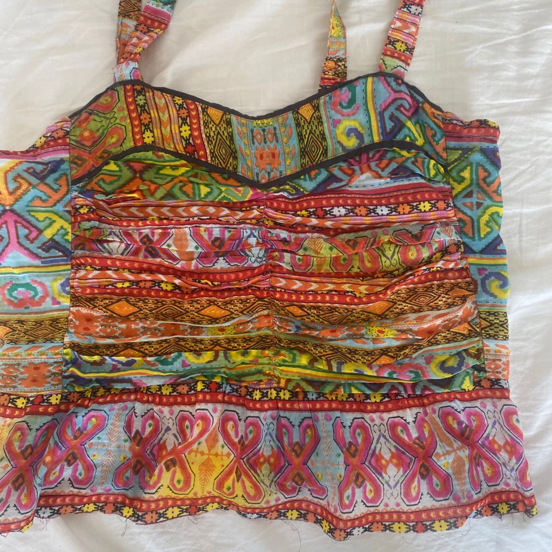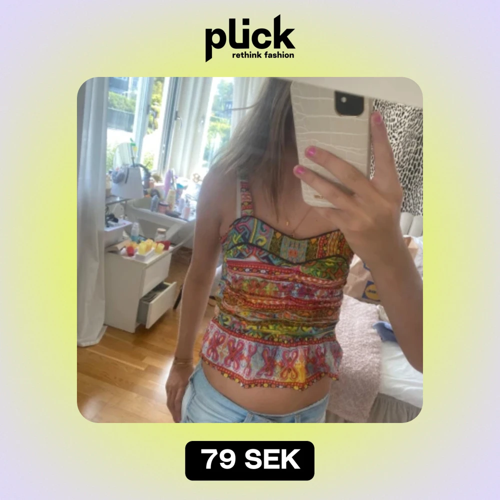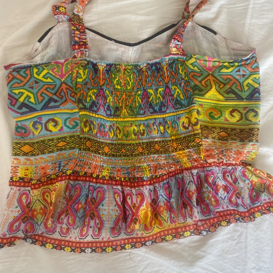 Säljer en superfin färgglad topp med olika mönster. Toppen har smala axelband och en volangdetalj längst ner. Perfekt för sommaren och festliga tillfällen! 🌸