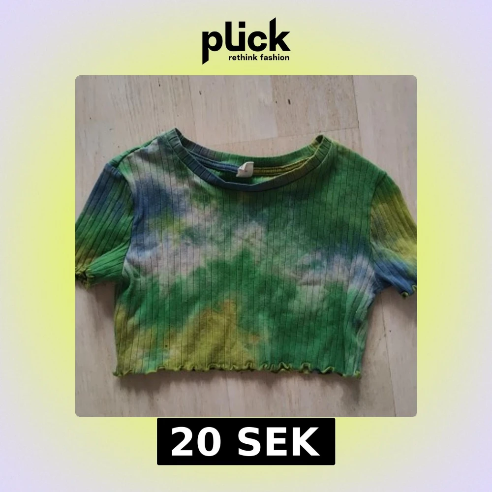 Säljer en cool ribbad topp från Shein i gröna, blå och gula nyanser med ett tie-dye mönster. Toppen är croppad och har korta ärmar, perfekt för en färgglad stil.