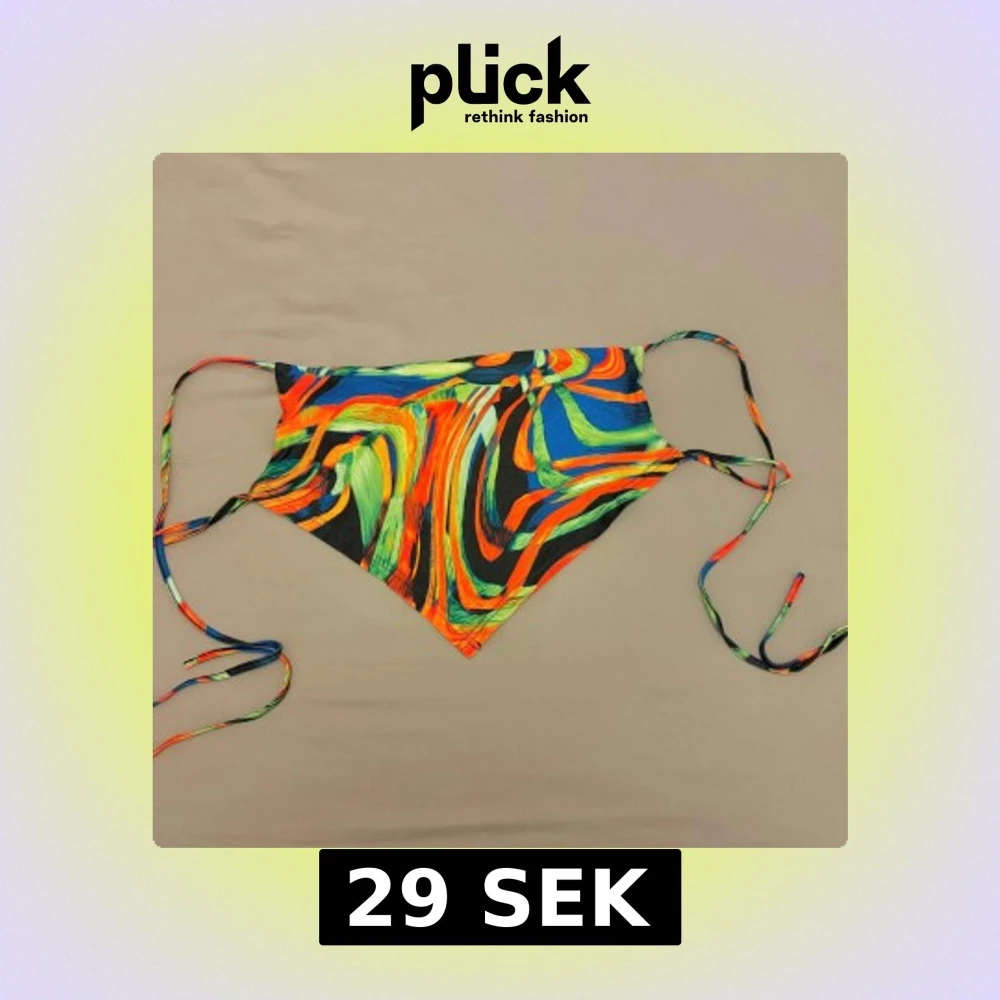 Säljer en färgglad topp med abstrakt mönster i blått, orange, grönt och svart. Bikinin har smala axelband och snörning i sidorna för justerbar passform. 🌸