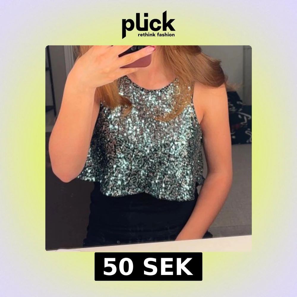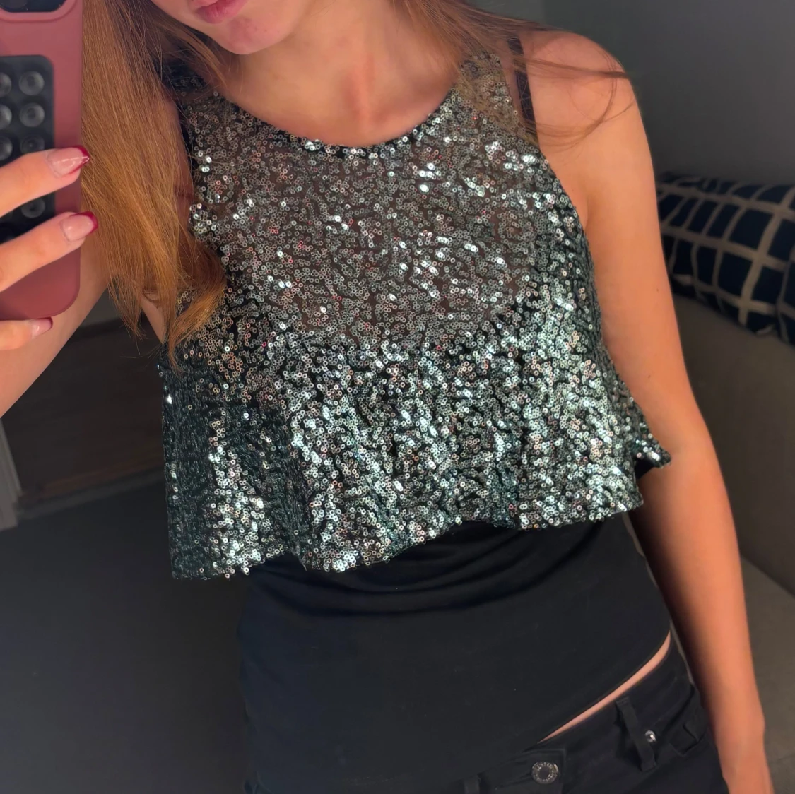 Snygg glittrig topp i blå med ärmlös design. Perfekt för festliga tillfällen med en croppad passform som ger en trendig look.