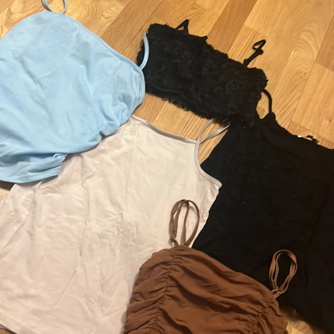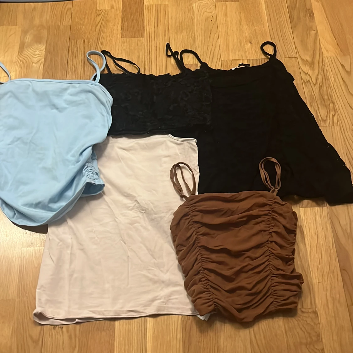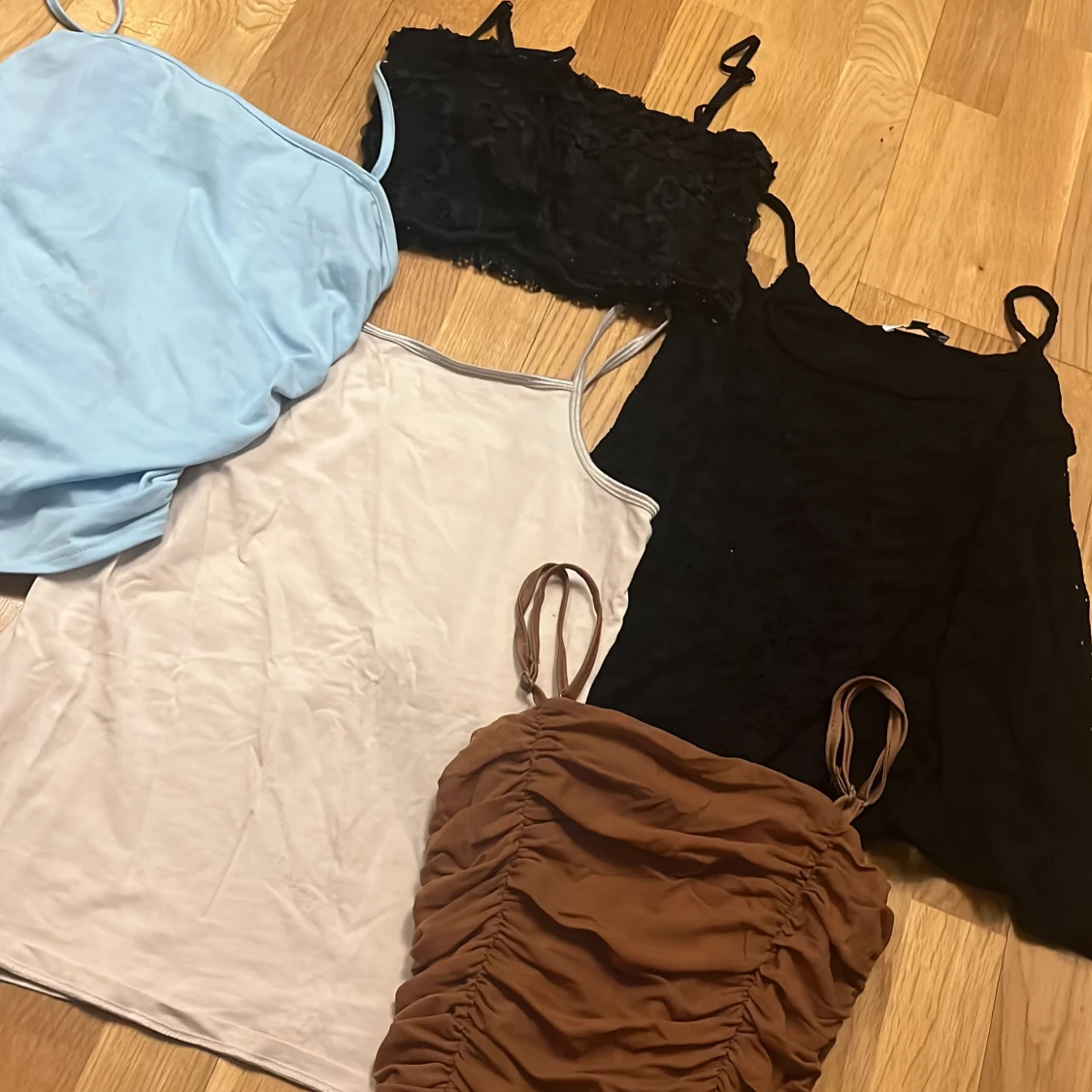 Säljer fem linnen: ett ljusblått med smala axelband, ett ljusrosa med smala axelband, ett svart spetslinne , en svart topp med ros mönster och ett brunt med rynkade detaljer. Perfekta för sommaren och kan matchas med olika outfits.