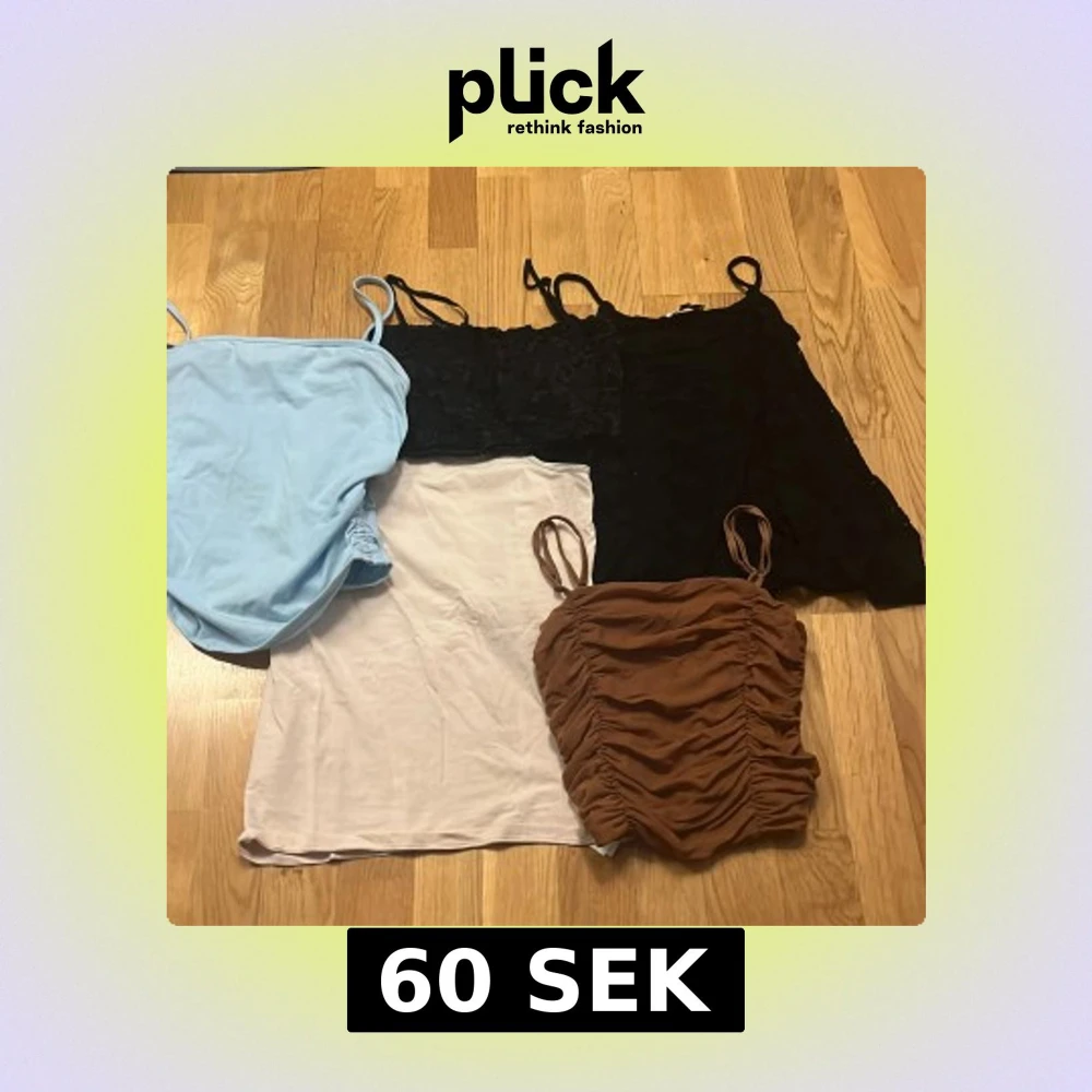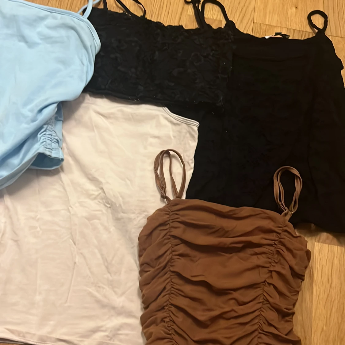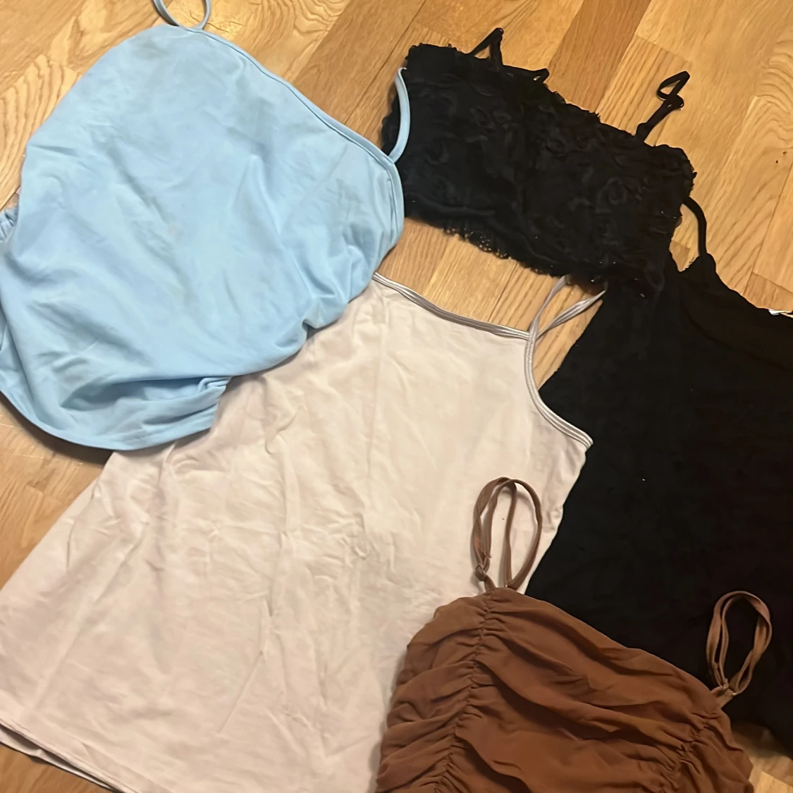Säljer fem linnen: ett ljusblått med smala axelband, ett ljusrosa med smala axelband, ett svart spetslinne , en svart topp med ros mönster och ett brunt med rynkade detaljer. Perfekta för sommaren och kan matchas med olika outfits.