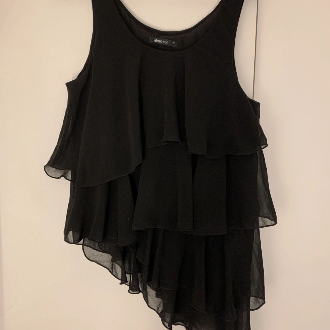 Linne med volanger och asymmetrisk botten. Köpt från gina tricot storlek 38. I stort sett i nyskick bara använd 1 gång på en examen. Sen har den tyvärr bara legat för den är i fel stil för min smak.