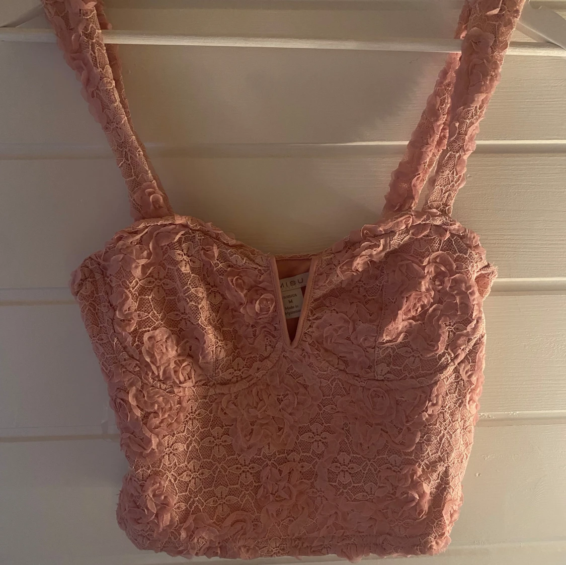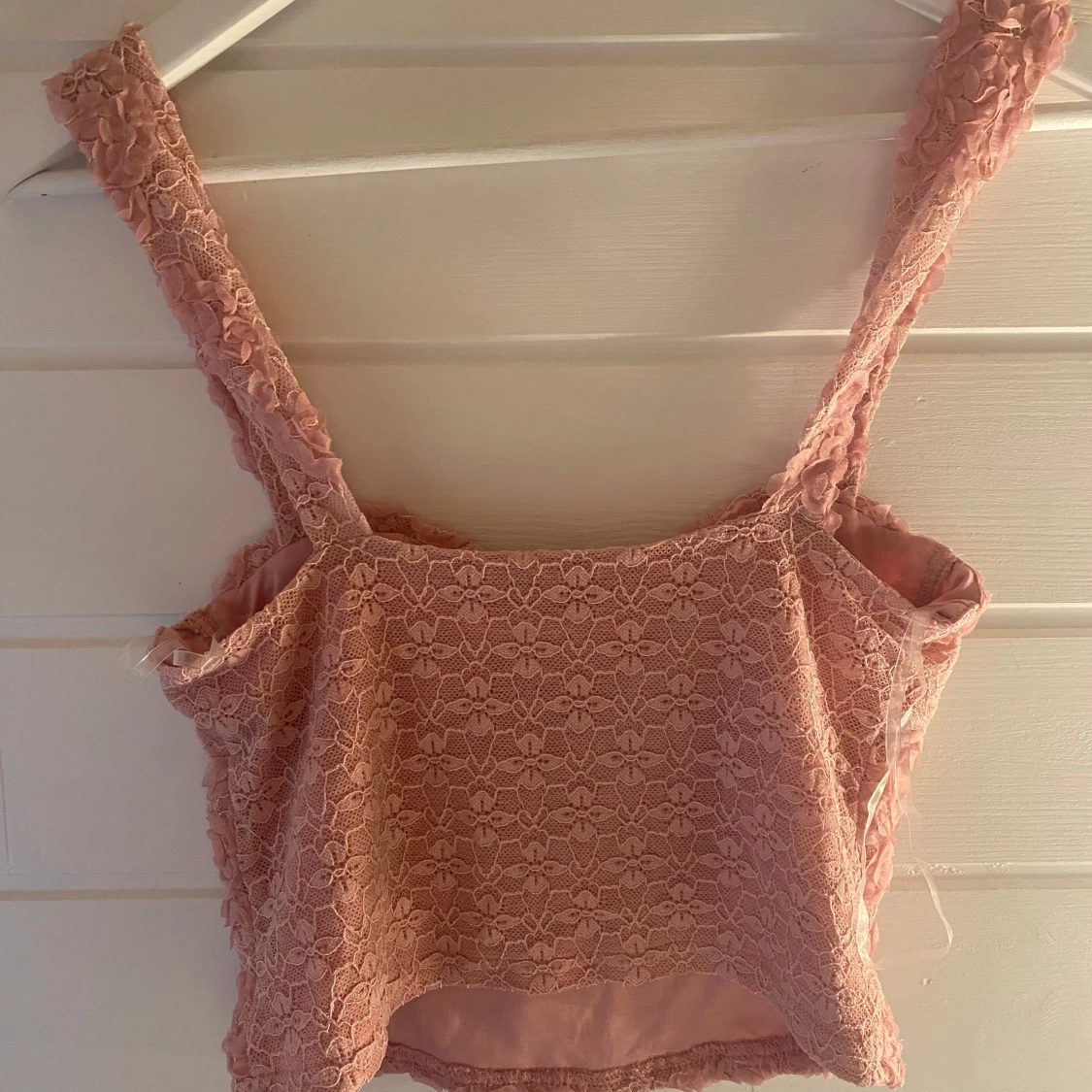 Säljer en superfin rosa croppad linnetopp från NewYorker med v-ringning och spetsdetaljer. Toppen har breda axelband och är täckt av blommig spets, perfekt för att lyfta vilken outfit som helst. Aldrig använd💞