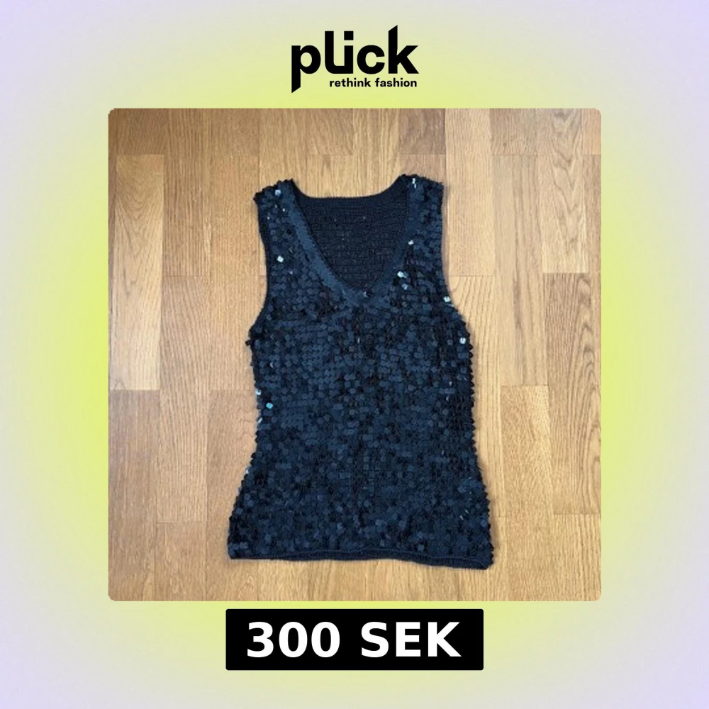 Säljer en svart ärmlös topp täckt med glittrande paljetter. Toppen har v-ringning framtill och är figurnära i modellen. Perfekt för dig som vill sticka ut med en riktigt glittrig look. Materialet är syntet och paljetterna ger en cool och festlig känsla.