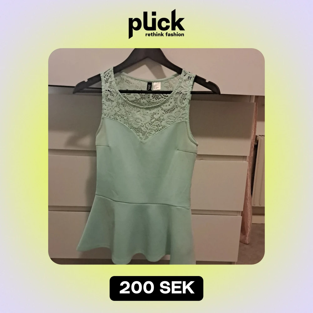 Säljer en superfin mintgrön topp från Divided i storlek S. Den har vackra spetsdetaljer upptill och är ärmlös med en peplumformad nederdel. Perfekt för sommarens fester eller en dag på stan! 💚