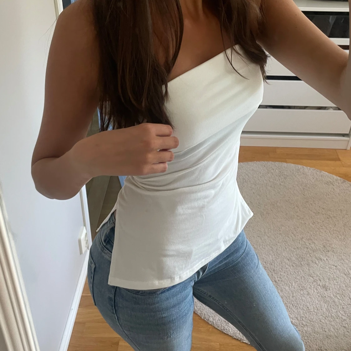 Säljer en stilren vit oneshoulder topp med figurnära passform. Toppen har en asymmetrisk skärning över axeln och är tillverkad i ett mjukt material som sitter snyggt på kroppen. Perfekt för dig som gillar minimalistisk stil.