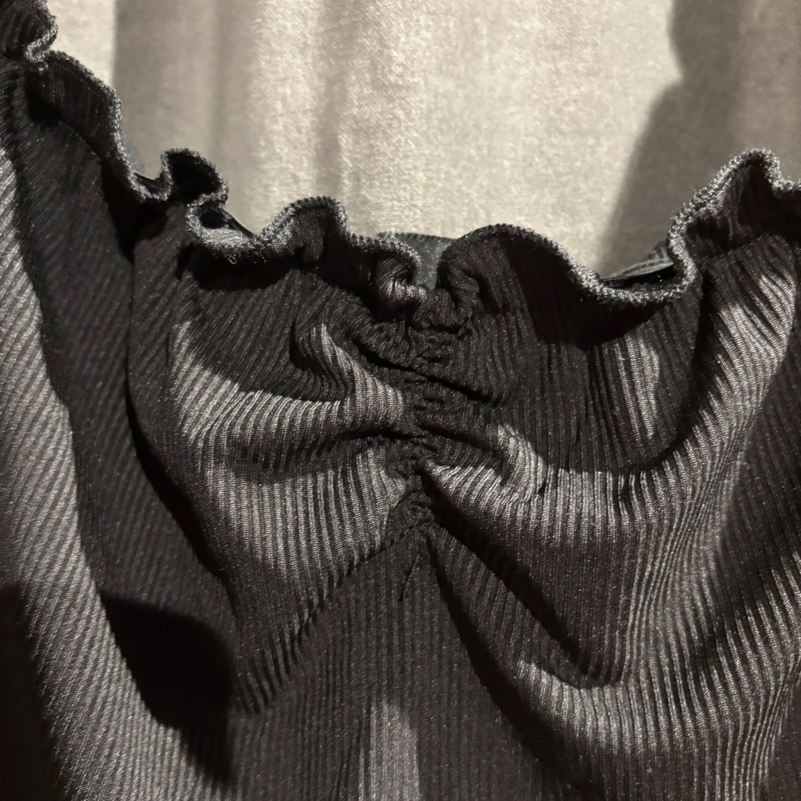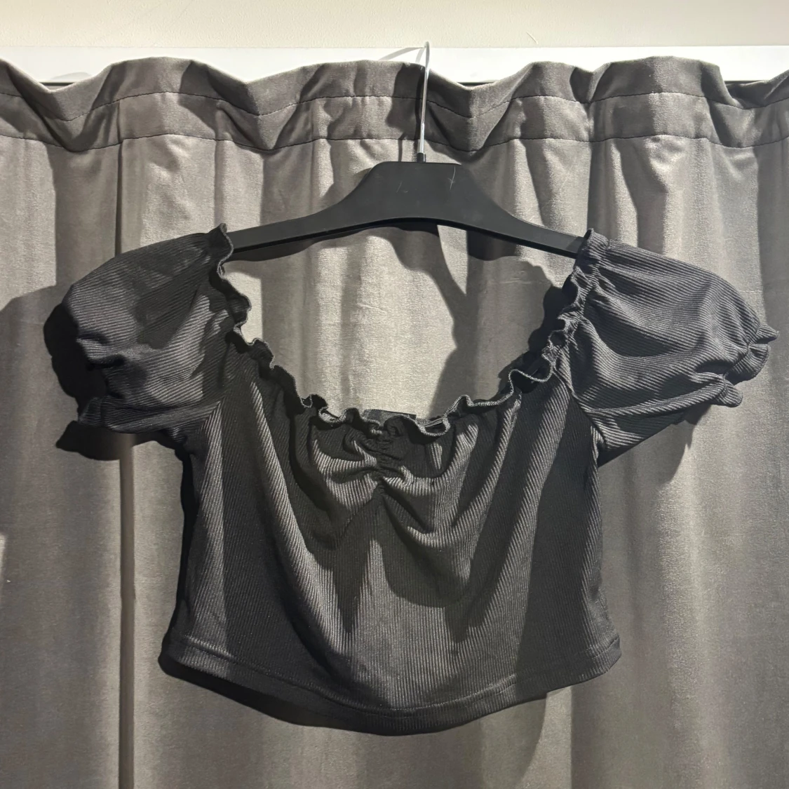 Säljer en svart ribbad croppad topp från Shein med korta puffärmar och en söt knytdetalj framtill. Skriv gärna om eventuella frågor.🩷